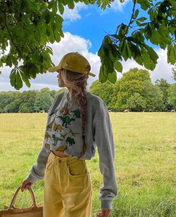 Or just wear a short sweatshirt with high-waisted pants. In terms of color, choose bright yellow pants that are very popular this year, and gray belts. The sweatshirt with cartoon pattern is very youthful and energetic, and the baseball cap of the same color forms a color echo. This style of matching looks good on both tall and short people.