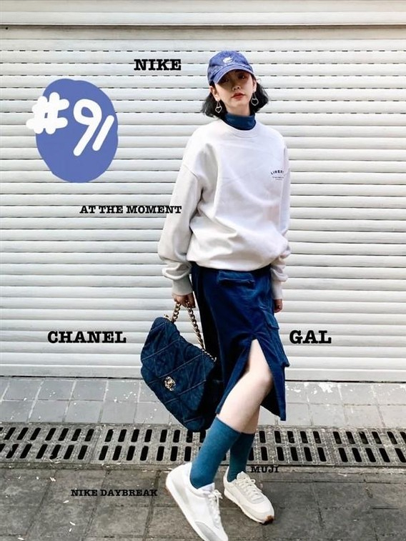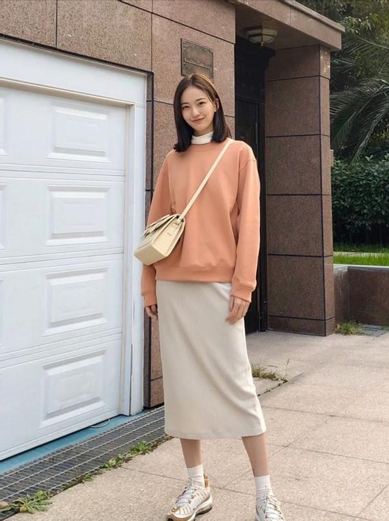 If you want a gentle skirt, you can choose a velvet skirt with a certain slit design and match it with a sports-style sweatshirt. It is also a mix and match style, which will give people a bright feeling. Matching hats and socks with the same color will be more refined, sporty and elegant.