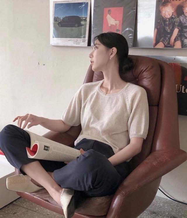 This year, slit floor-length trousers are also particularly popular, shaping a perfect figure, and the upper body is matched with knitted The T-shirt is gentle and elegant.
