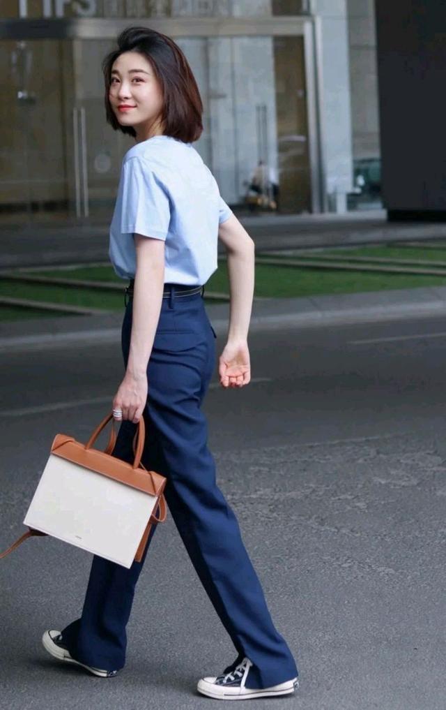 The upper body is matched with a pink T-shirt, and the lower body is a darker color, which looks particularly high-end. Pants have a certain sense of age and are more friendly to apple-shaped figures. They are cool and very fashionable to wear in summer, with a neutral feel.