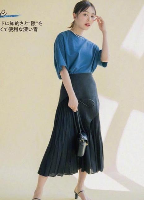 This blue T-shirt is in line with the positioning of mature women, giving people a sense of mystery and elegance, and Wearing a colorful top in summer will not look monotonous, but the skirt matched with the lower body should be based on basic colors, otherwise the overall color matching will be too serious.