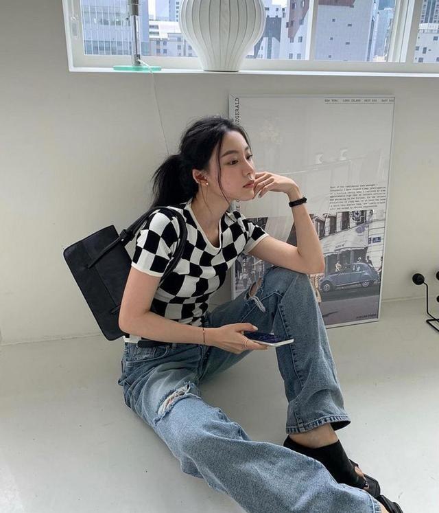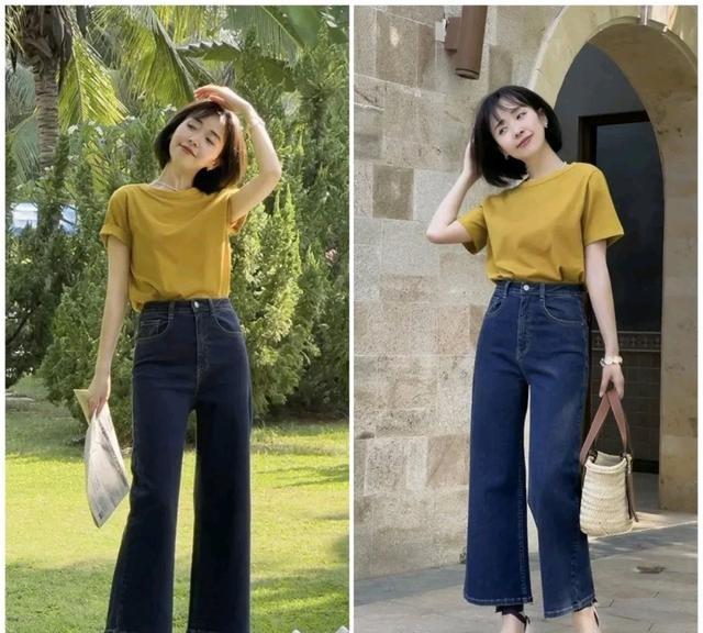 The combination of knitted T-shirt and floor-length blue jeans is very elegant and fits the positioning of young and mature women. In the summer, this combination may be a little hotter, but as long as the fabric of the jeans is better, it won’t have much impact.