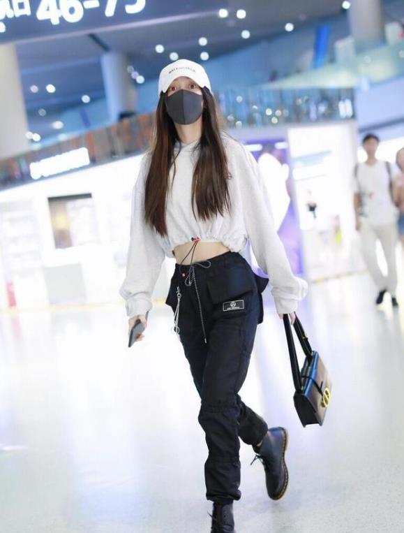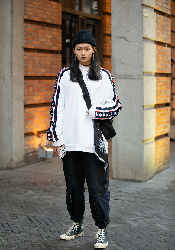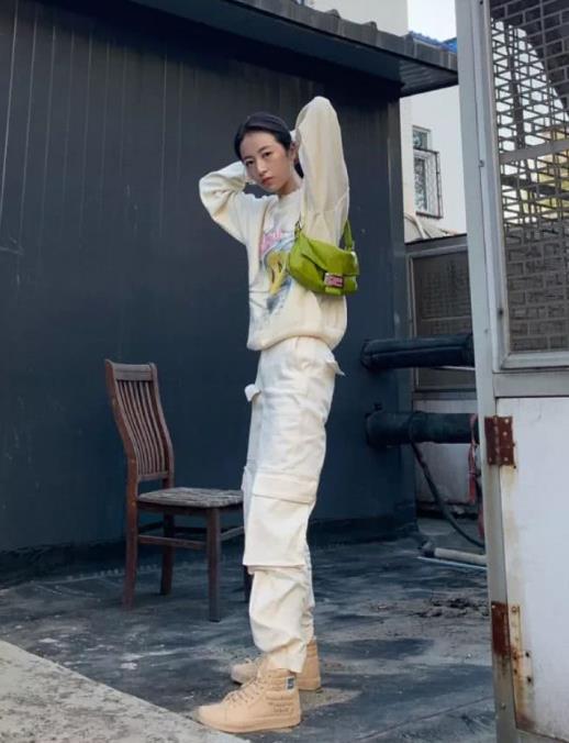 Needless to say, the versatility of the black cross-body bag, the white sweatshirt with fashionable patterns is simple and fresh, but also reveals the visual aspect. A sense of fullness. Black work trousers with a metal zipper design, comfortable and convenient to open and close, and the trousers cuffs are slightly rolled up, making them look neat and capable.