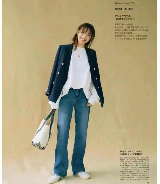 For mature women, pair it with a navy blue suit jacket to add a sense of sophistication The feeling just combines the childish feeling brought by the pure white sweater, and the lower body is matched with blue Colorful long jeans are not very formal, but they enhance the charm and temperament.