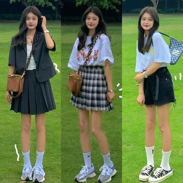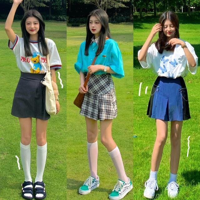 Summer requires color for embellishment, but not too exaggerated. If you like white T-shirts, then The colorful prints give you a cute age-reducing style. The lower body is paired with a gray skirt, and sports-style sandals create a youthful and energetic look. The whole-body blue-green polo T-shirt paired with a plaid skirt is also an expression of youthfulness.