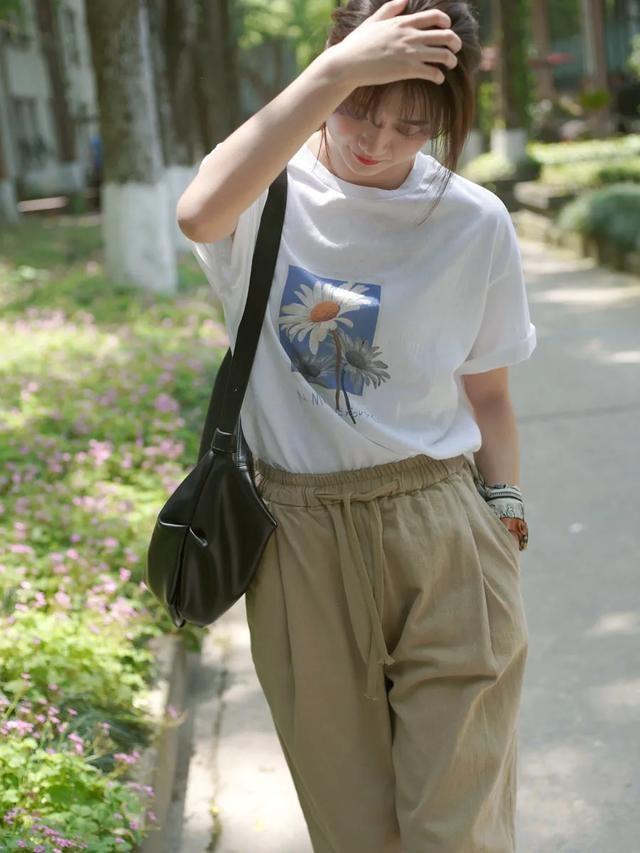 In fact, a simple white T-shirt will not look inconsistent when paired with simple trousers, and it is fashionable enough for daily wear, such as this white one with printed elements. Simple, the lower body is in khaki trousers, using the colors to create a sense of hierarchy, and the combination of shades, making it fashionable and elegant.