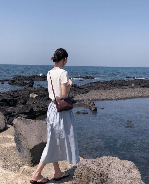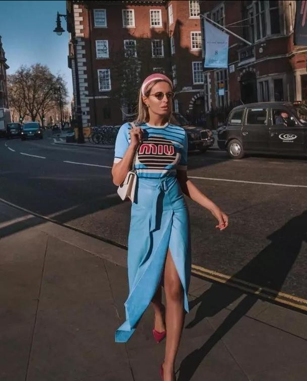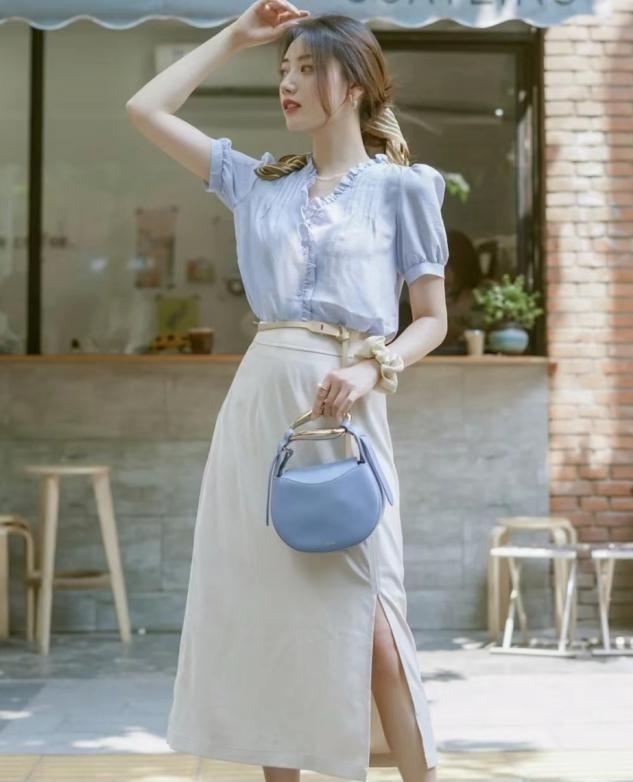 This simple blue has an elegant femininity and can show a strong gentle temperament when paired with a khaki slit skirt. The combination of handbags, bags, etc., creates a gentle side of women.