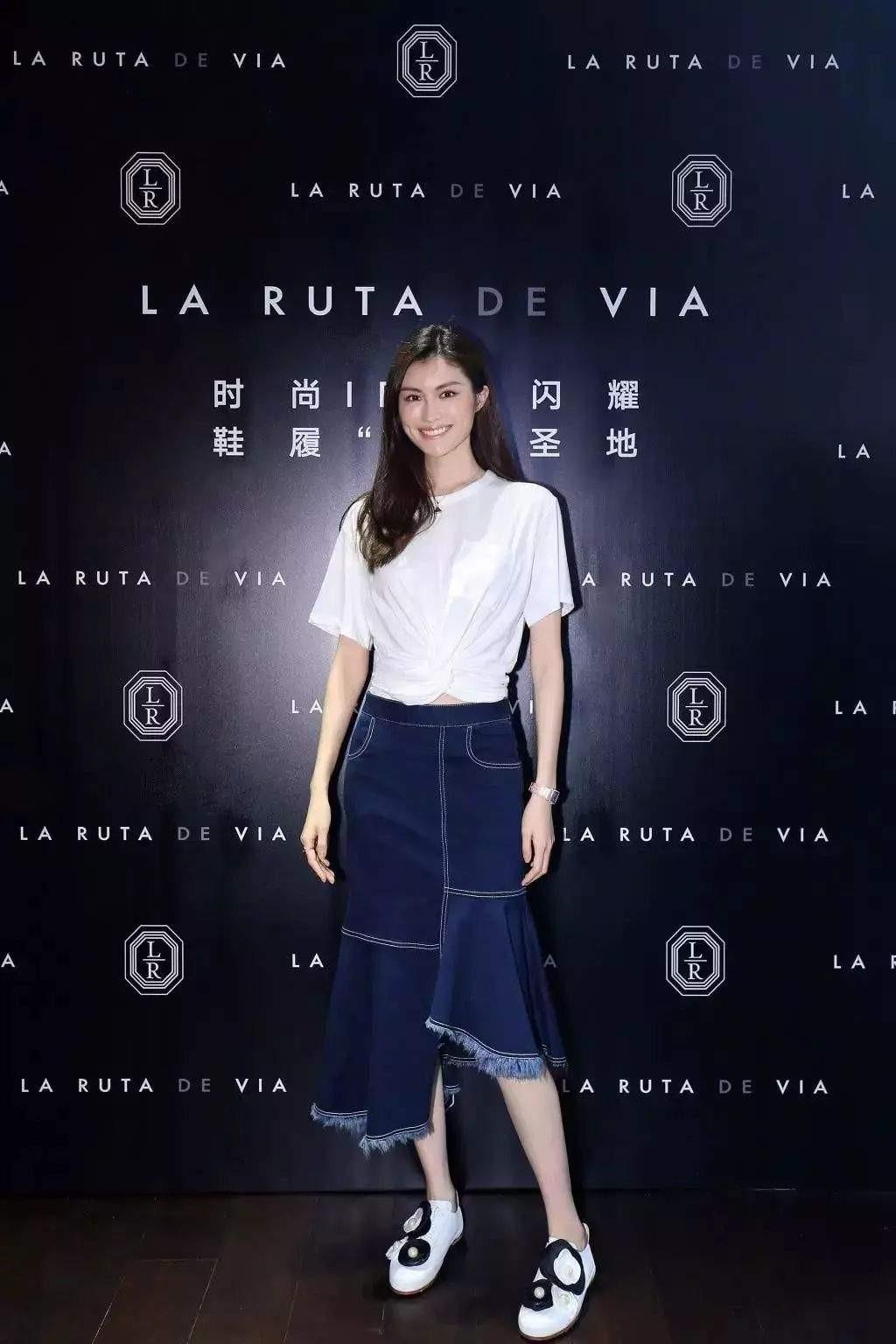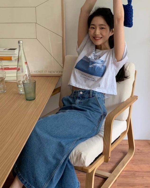 When wearing a solid-color skirt, you can consider the fabric. For example, this white short T-shirt is relatively simple, paired with a long denim skirt. , has a youthful vitality, the straight-line skirt is more flattering to the figure, and has a light-handed temperament.
