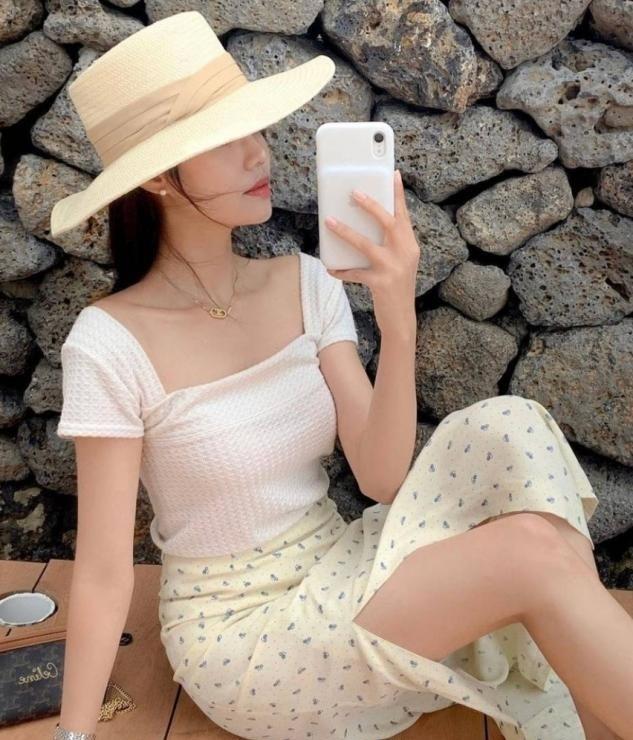 This kind of T-shirt with a feminine retro feel, paired with a floral skirt, has a sexy and pure style, especially the design of the neckline, through the large area of exposure The skin is used to highlight the characteristics of women, and the floral skirt is also extremely simple and elegant.