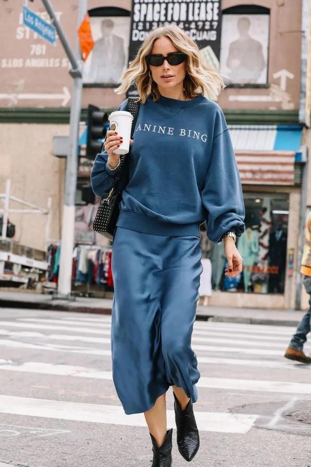 But this fall, fashionistas are beginning to wear skirts with sweatshirts, which are high-end and elegant, combining two different styles. Styled items blend together to create different sparks. Don’t always wear sweatshirts with jeans. Wearing this style is popular this year. It looks fashionable and elegant!