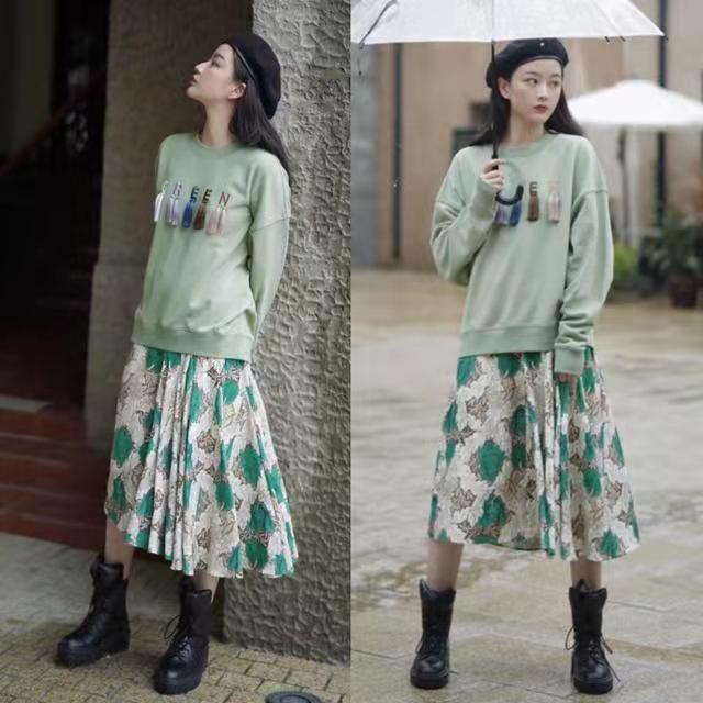 The matching of sweatshirts and skirts can also be more bold. Choosing skirts with printed elements can be said to combine elegance and sweetness, It may be easier to use the same color system when matching.Choose a green sweatshirt for the upper body and a skirt with green prints. The color is enough to balance the shape, make it more western, and there will be no messy effect. .