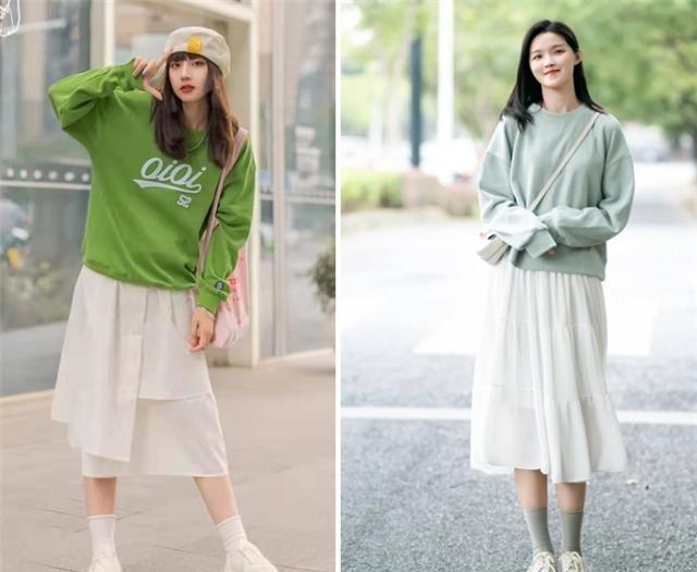 On the left, dark colors and white are used to match, forming a contrast and contrast, while on the right, a colorful sweatshirt is chosen Paired with a small white skirt, the saturation is relatively high and can be reflected on the face. There are still certain requirements for skin color. You can use various methods such as dark and light contrast or color blending into white to create a sweatshirt. Match and match to create a fashionable look.