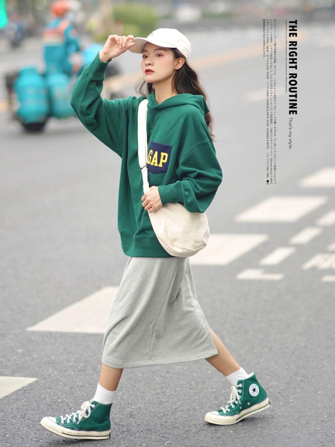 The combination of a hooded sweatshirt and a skirt is especially suitable for short girls. A knee-length skirt will not make the overall appearance It looks so depressing, and can leave short girls with more leg space, so this kind of item can make you look a little sexy. The simple green sweatshirt has a niche atmosphere, and the green canvas shoes embellish the sweater. , such a suit is fashionable and stylish.