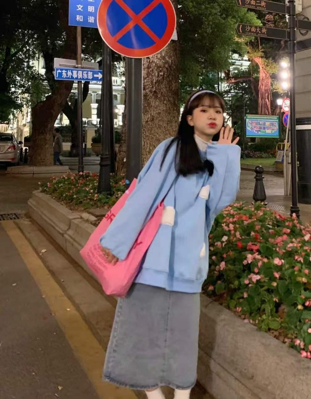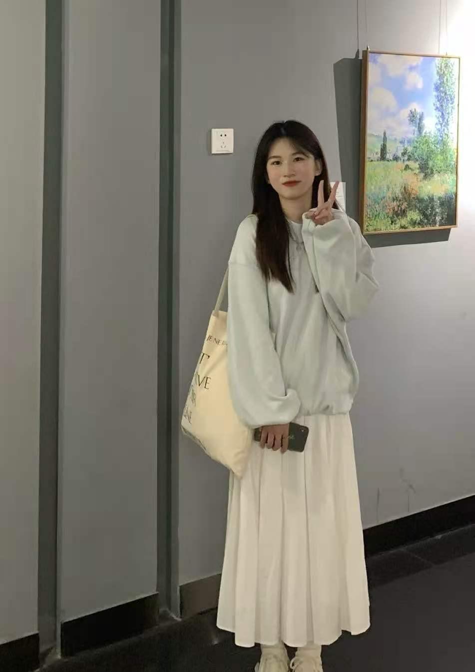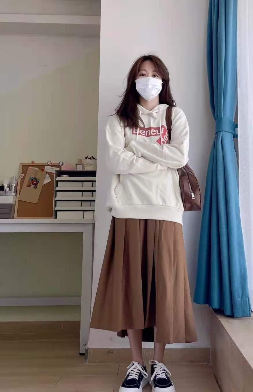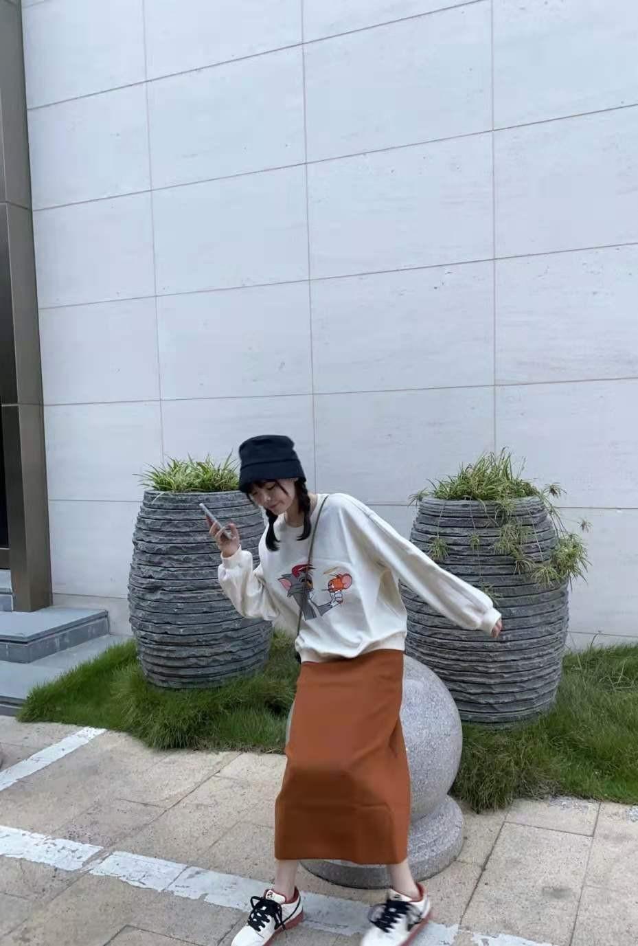 Sweatshirts and knee-length skirts are both items in the autumn clothing series. They are highly photographed in daily life and can be captured on the streets basically every day. See the two figures. However, most people wear them separately, and few people wear a sweatshirt and a knee-length skirt together. You might as well give it a try to ensure that you can unlock a different fashion charm.