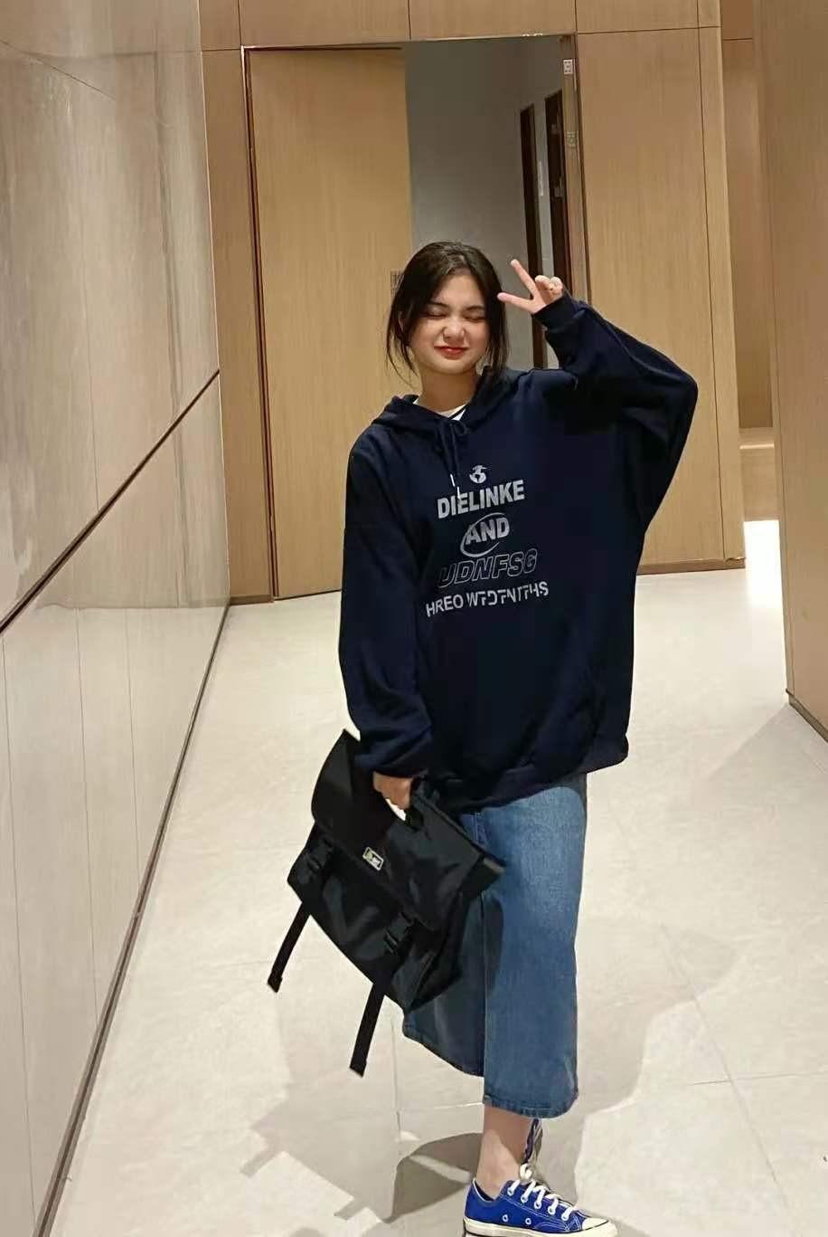 Following this technique, it will be much easier for us to choose styles. Most sweatshirt styles are simple. In comparison, only hooded sweatshirts look cumbersome. Because the hooded sweatshirt is loose and bulky, when paired with an over-the-knee skirt, it is recommended that you give priority to a straight-length over-the-knee skirt for these two reasons.