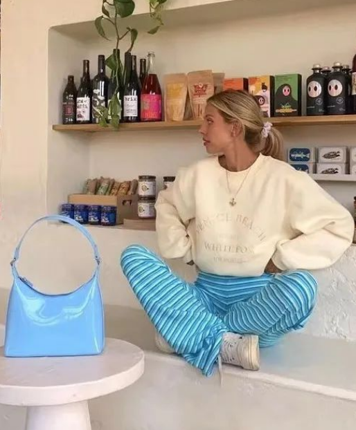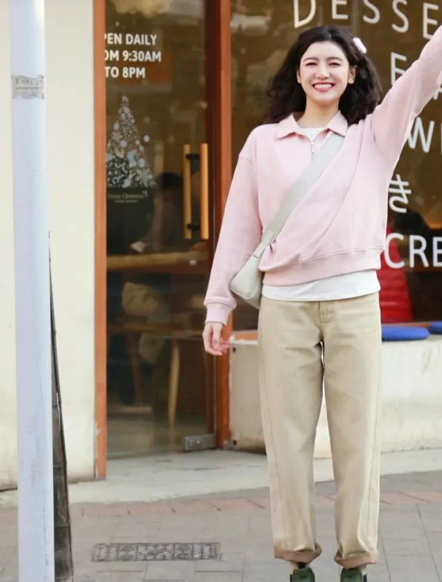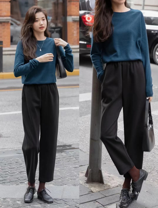 If your leg shape is not very good, you can wear carrot pants that are wide at the top and thin at the bottom, which will make your legs straighter. Moreover, carrot pants are generally high-waisted, and when paired with a sweatshirt, the overall proportions will be very clear.