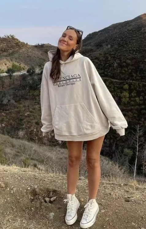 And this is a good example of how to wear a sweatshirt correctly: the contrasting colors make you look younger and younger. The whole top and bottom have a sense of curve, and the sweatshirt is not too long to cover the body, and it highlights its casual and simple style.