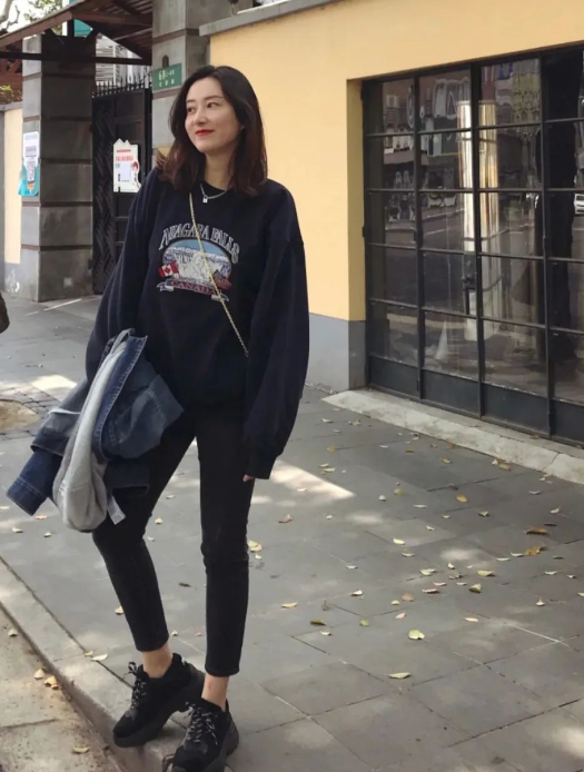 The style of sweatshirts has always been relatively loose, so follow the matching tips of wide at the top and tight at the bottom. We can wear these tight black pants or jeans to make the legs appear thin. The three-quarter length exposes the ankles and is also stretchable. Long-legged effect. And the contrast between wearing it this way and the upper body is also very strong.