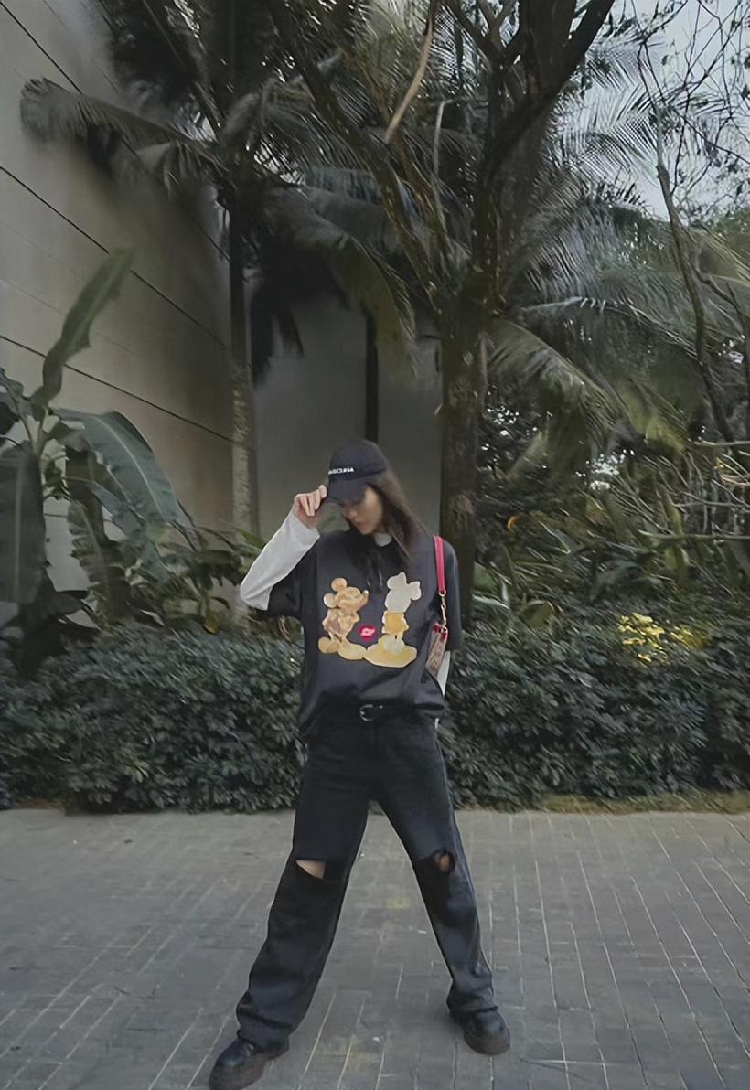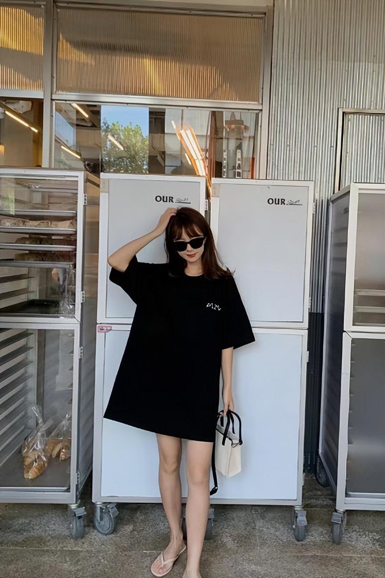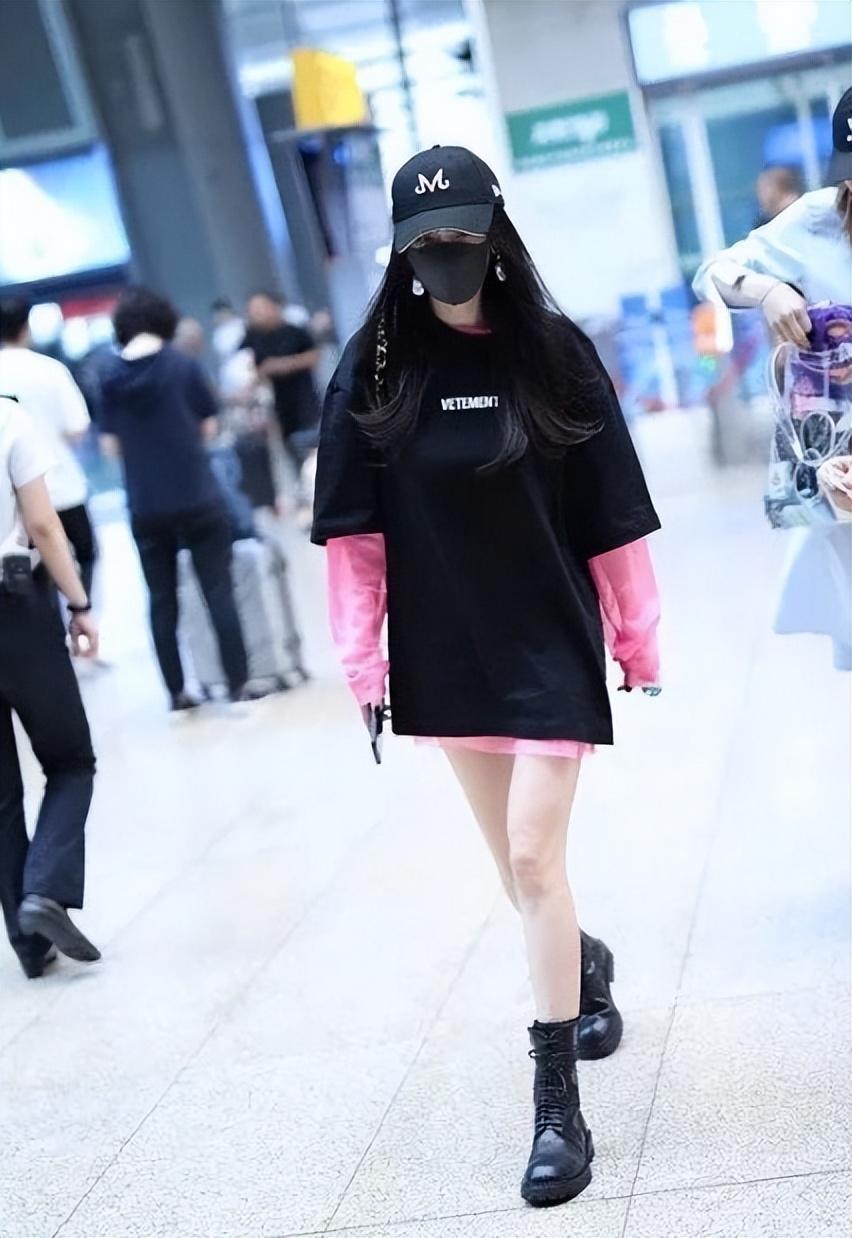 A thin pink sweatshirt with its own highlights, the lazy version has a sweet and cool fashion temperament, and the outer mid-length The sexy black T-shirt, with the pink and black color scheme, makes the whole person look more like a hot girl in the leg-exposing outfit.