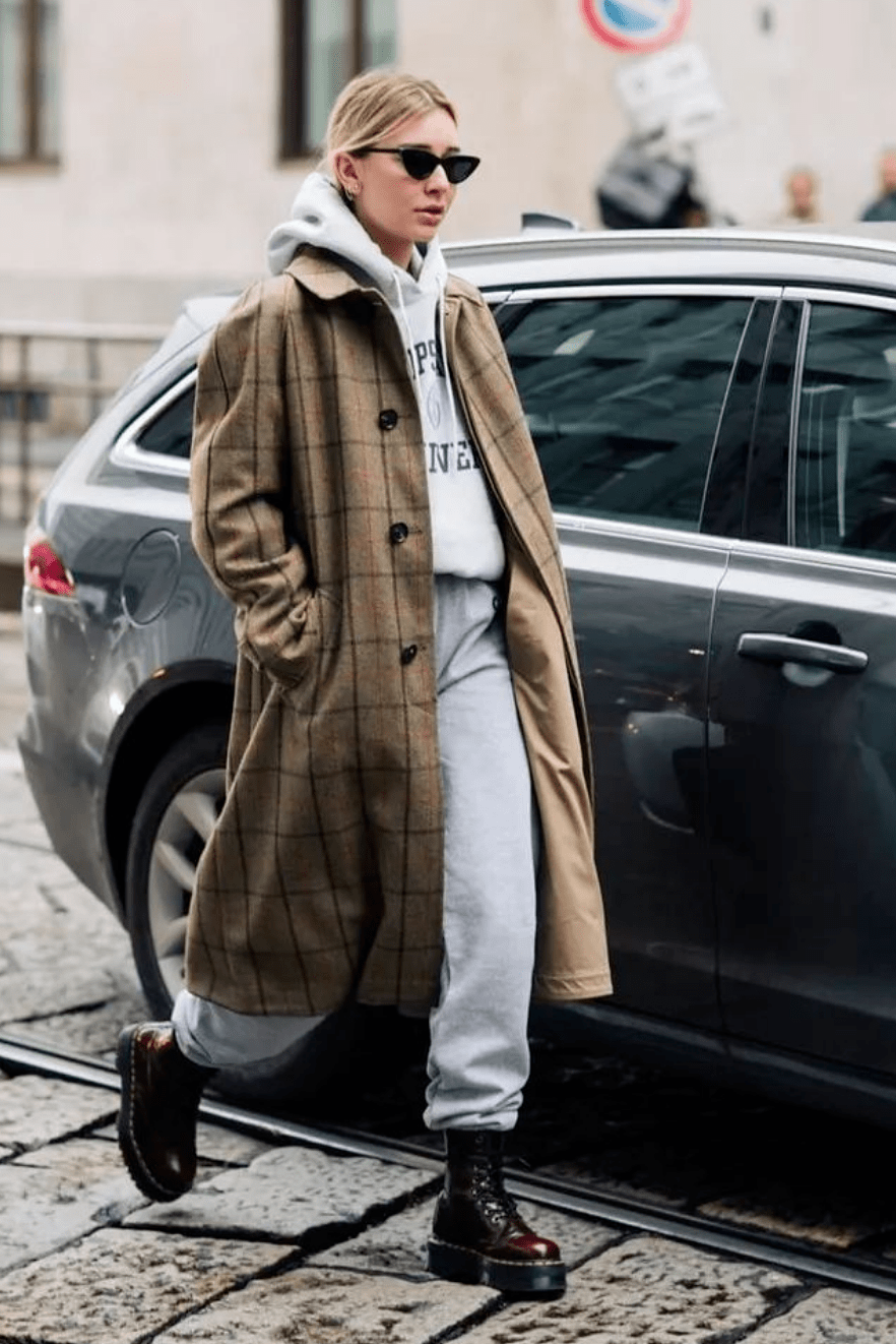 Like this beige sweatshirt paired with a long coat, the inside and outside are well connected. The light and warm tones reduce the boringness. Paired with a pair of sports pants and a pair of Martin boots, it has a street style. Every single item is very classy. But everything is connected very well.
