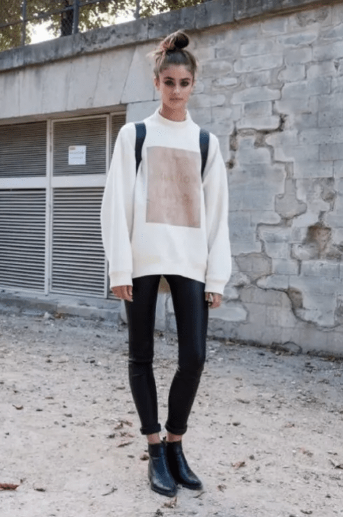 Either pair it with shorter trousers or skirts, or fold the trousers. Showing off the style can make Chelsea boots have more of its own style. Of course, your temperament will also be contained in it. Like this white sweatshirt paired with high-waisted black pleated trousers, the top is wide and the bottom is slimmed down and looks good.