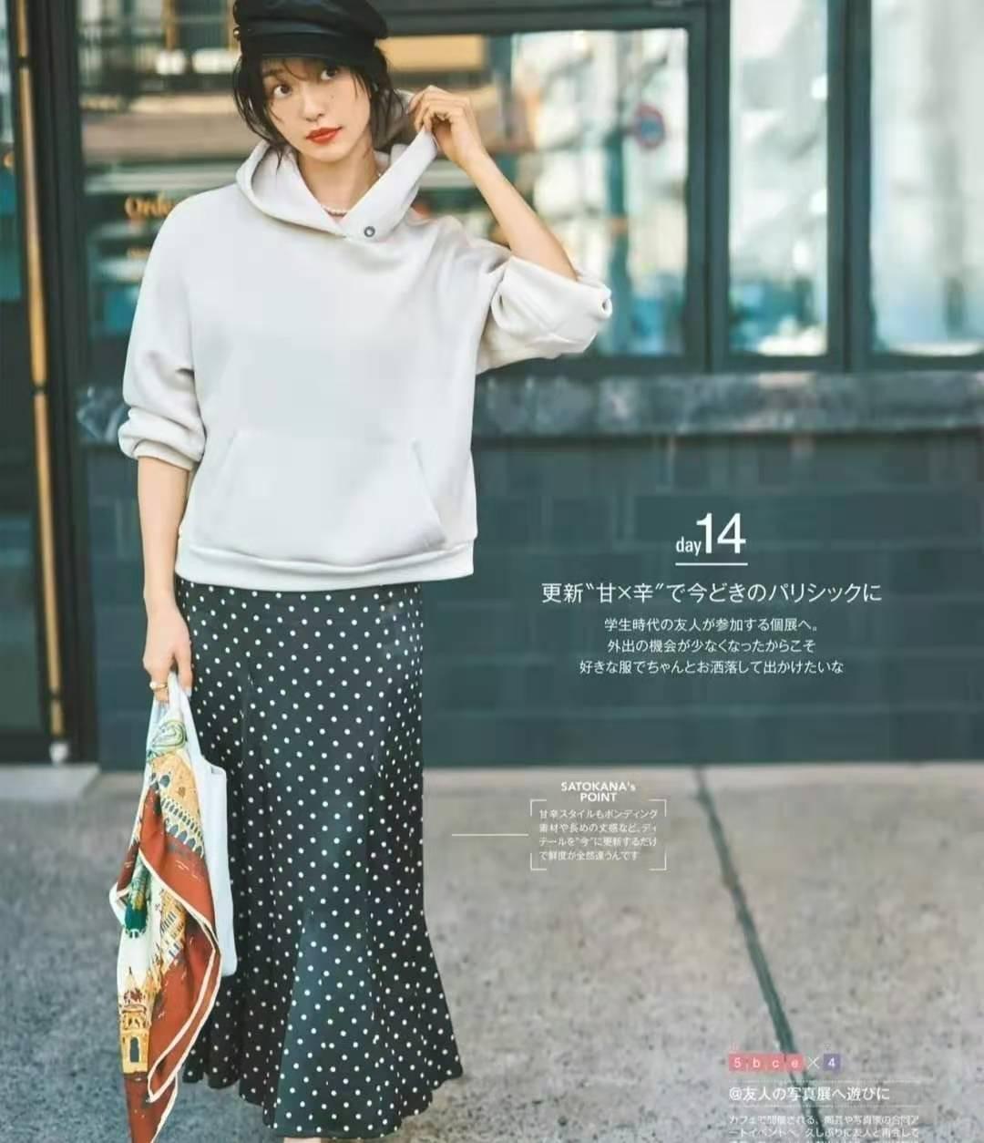 My suggestion is to emphasize the waistline position, because the hem of the sweatshirt and the hem of the skirt are mainly loose. Match the two to emphasize the waistline. Not to mention the height, it is easy to divide the figure into 50-50.