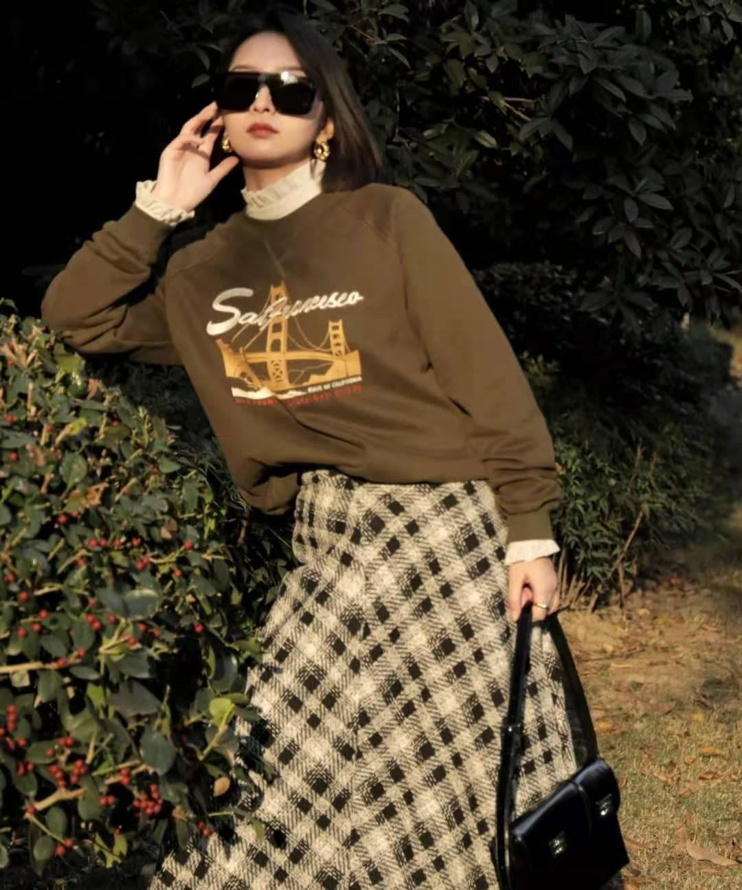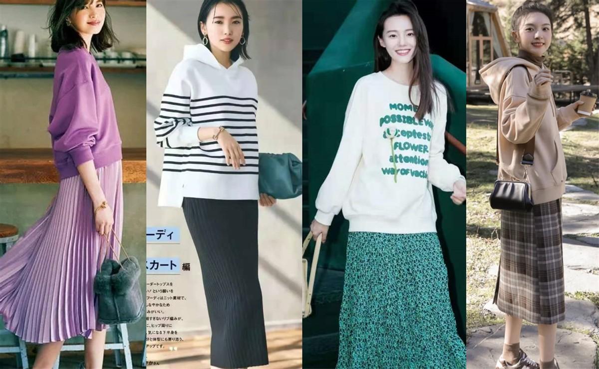 Whether it is the above “sweatshirt + pleated bust Skirt”, “Sweatshirt + Straight Skirt”, “Sweatshirt + Printed Skirt”, “Sweatshirt + Plaid Skirt”, all are stylish and good-looking. It can be seen that “Sweatshirt + Skirt” is also a matching method worth trying. .