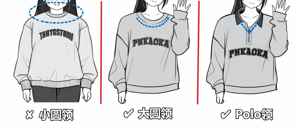 Choose the right style: The neckline should expose the collarbone and2~3cm below the collarbone, so as not to look bloated; or choose a Polo collar sweatshirt and pull the zipper below the collarbone.