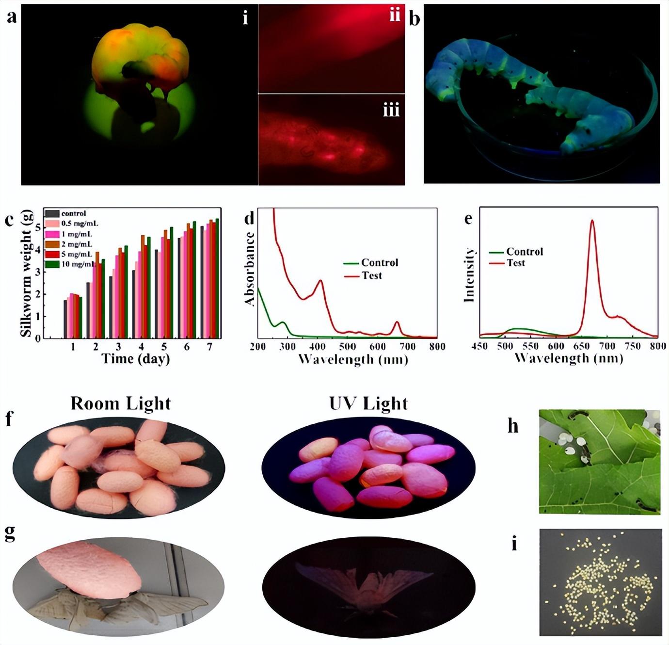 After feeding with this CDs, silkworms will emit bright red fluorescence, and can grow healthily and form cocoons normally. The cocoons will appear pink in the sunlight. Color, bright red fluorescence under ultraviolet light. The metabolic pathway of CDs can be obtained by anatomical analysis of experimental silkworms and cocoons, that is, fluorescent CDs are absorbed by silkworms from the digestive tract, then transferred to the silk glands, and finally enter the cocoons, and unabsorbed CDs are excreted with feces.