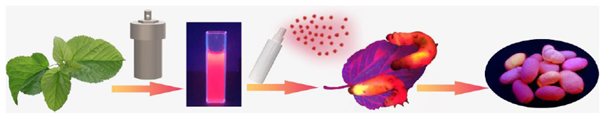 Natural silk has excellent biocompatibility and mechanical properties and is a widely used fiber material. However, under ultraviolet light irradiation, silk appears Light blue, light yellow or no fluorescent effect. Genetic modification technology and organic dye dyeing technology are common ways to prepare fluorescent silk, but they are costly , poor safety and environmental protection and other problems are also very obvious. Therefore, non-toxic, biocompatible, environmentally friendly, highly luminescent and Feeding silkworms low-cost substances appears to be one of the best ways to produce fluorescent silk.