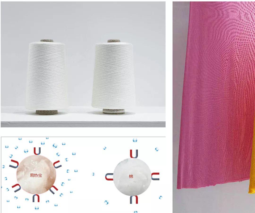 易热宝纤维是一种高回潮的改性腈纶纤维,引入了大量的-OH、-NH3、-COOH、-CONH等亲水性基团,吸湿性很高,在温度20℃和相对湿度65%的环境下,吸湿能力约是棉花的3.5倍。同时该纤维可以根据环境长期反复进行吸放湿(呼吸)式循环,吸湿的同时产生吸附热,即吸水后可自行发热。因此,这种纤维可以令织物吸收人体发出的湿气(微量水分)而产生热量,加快平衡皮肤与衣物的温度,缓和调节两者温差。此外,易热宝纤维极高的吸湿性能可以防止出汗后的冷感,让衣内长时间干爽舒适,一直具有暖融融的感觉。