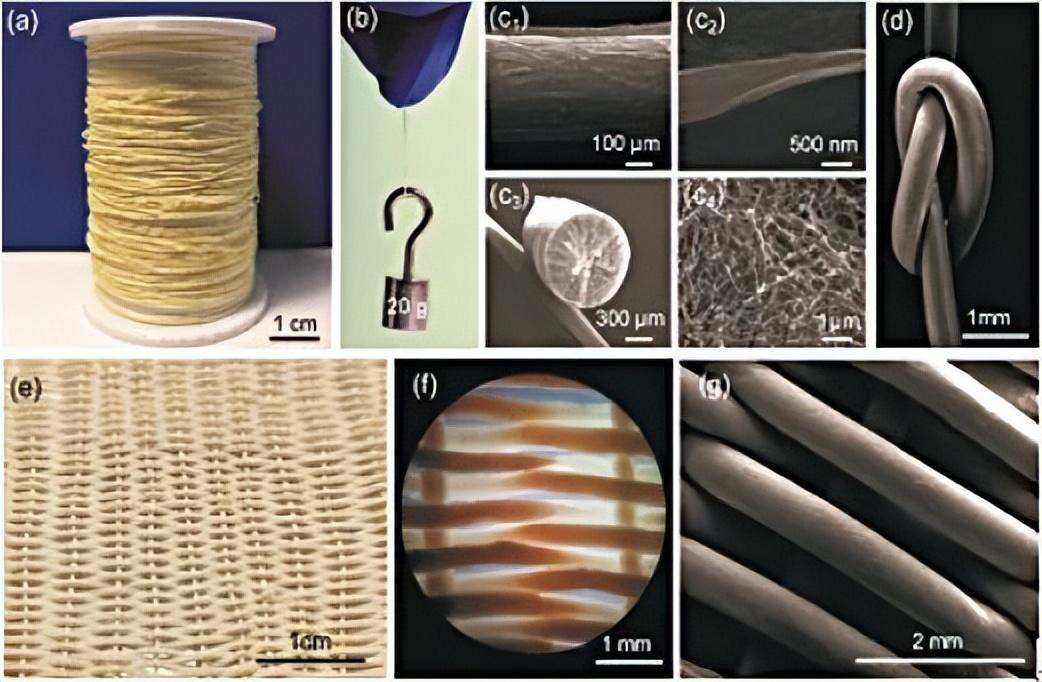 凯夫拉气凝胶纤维是通过溶解杜邦TM的Kevlar纤维获得纳米纤维分散液,然后进行湿法纺丝、特种干燥等过程制成的,孔隙率高达98%,比表面积达240m2/g,该气凝胶纤维具有优异的力学性能,可以任意弯曲、打结、编织等,具有优异的隔热性能,常温下热导率仅为0.027W/m·K,在低温下其隔热性能是棉布的2.8倍,可在-196-300℃的极端环境下长时间发挥隔热保温性能;具有优异的化学稳定性,可进行染色、疏水化、化学镀等多种改性,且不损伤气凝胶主体骨架结构。重要的是该气凝胶纤维也可以通过填充相变材料制备成空调纤维,其热焓值可达162J/g,远超现有空调纤维的热焓值。