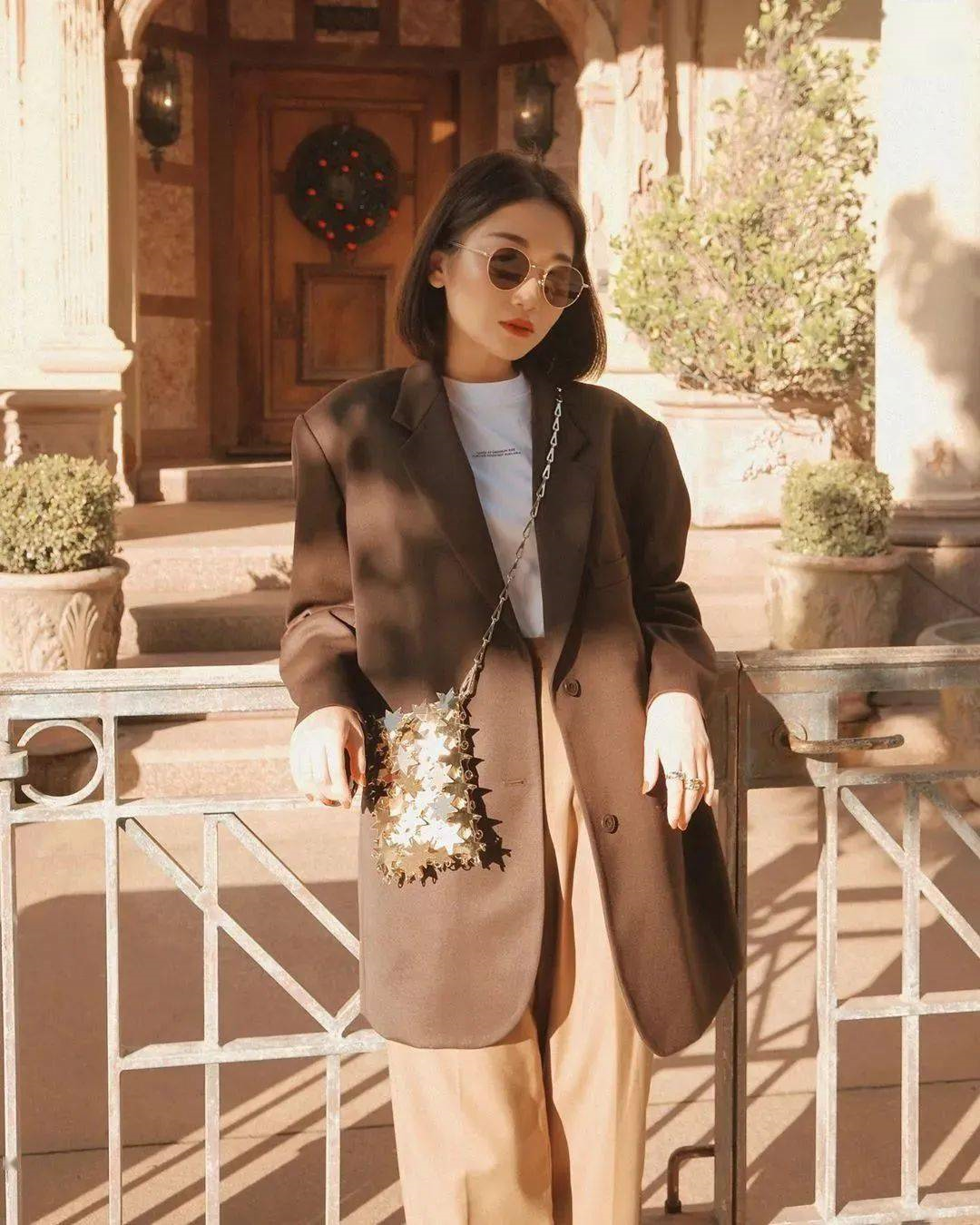 An oversize dark brown suit with a white short T-shirt underneath. The lower body is a beige high-waisted suit trousers with loose trousers. Echoing the large coat, the overall loose fit can make the figure appear more petite. Paired with the unique silver star mobile phone bag and black sunglasses, it exudes a unique fashion light.
