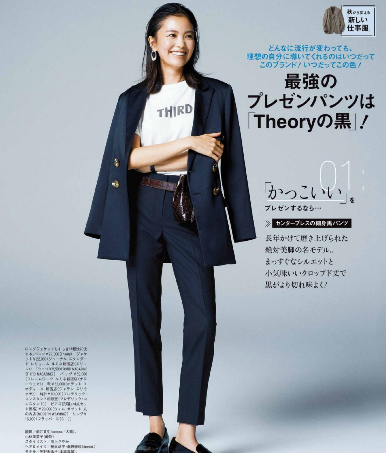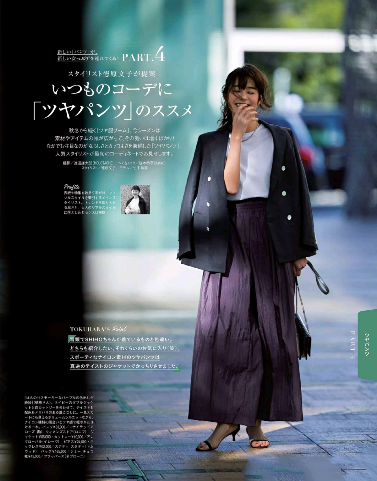 Camel-colored high-waisted suit trousers designed with cigarette pipes maintain a wide-top and narrow-bottom shape, which is great news for girls with wide hips. A dark brown suit, paired with a light-colored T-shirt as an inner wear, forms an elegant and high-end matching style. On the feet are a pair of black flat loafers. Although it has no obvious effect on increasing height, it is good for lengthening the legs. It’s obviously helpful.