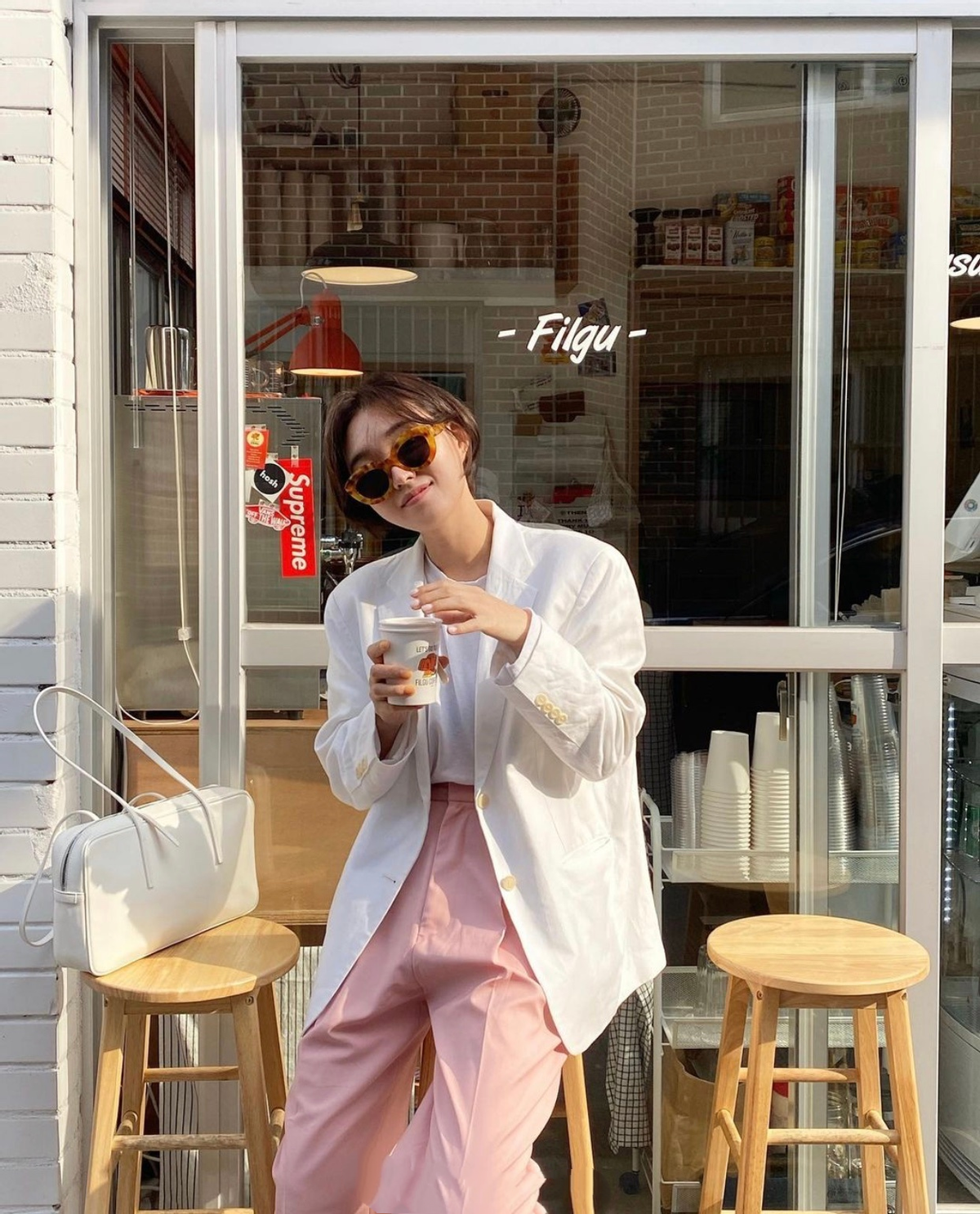 Light pink suit pants are not common, but they are more common among young women. Paired with pure white suits and T-shirts, they look great. Show spontaneity and individuality.