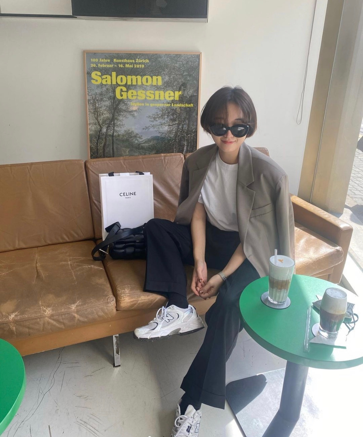 Earth-colored suits always bring us a classic yet sophisticated feeling. This young lady with short, middle-parted hair Sister, wear a khaki suit with black suit pants and thick-soled sneakers, full of lively and youthful sports atmosphere.