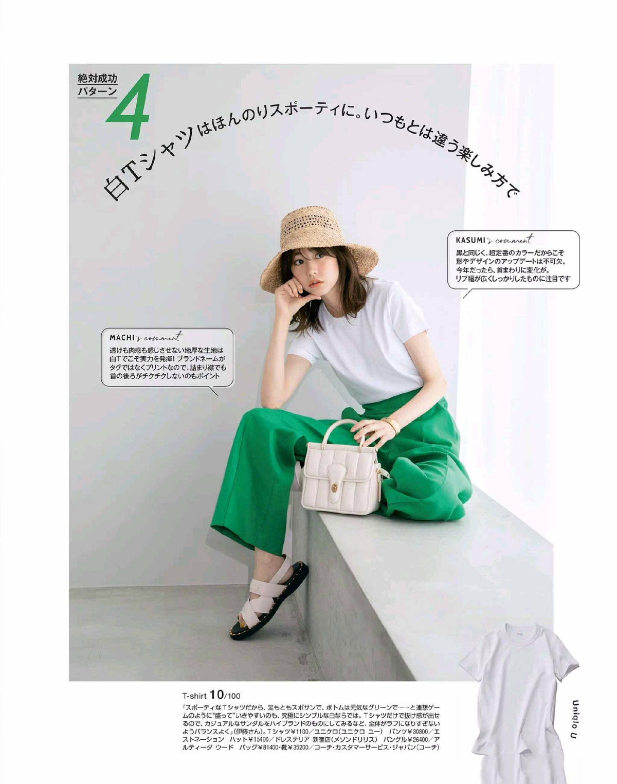 Refreshing dark green high-waisted suit wide-leg pants, paired with a pure white round-neck T-shirt with a simple design, giving people a fresh look It also makes her feel younger. The braided straw hat worn by the young lady is the finishing touch of the style, adding a casual and comfortable pastoral style.