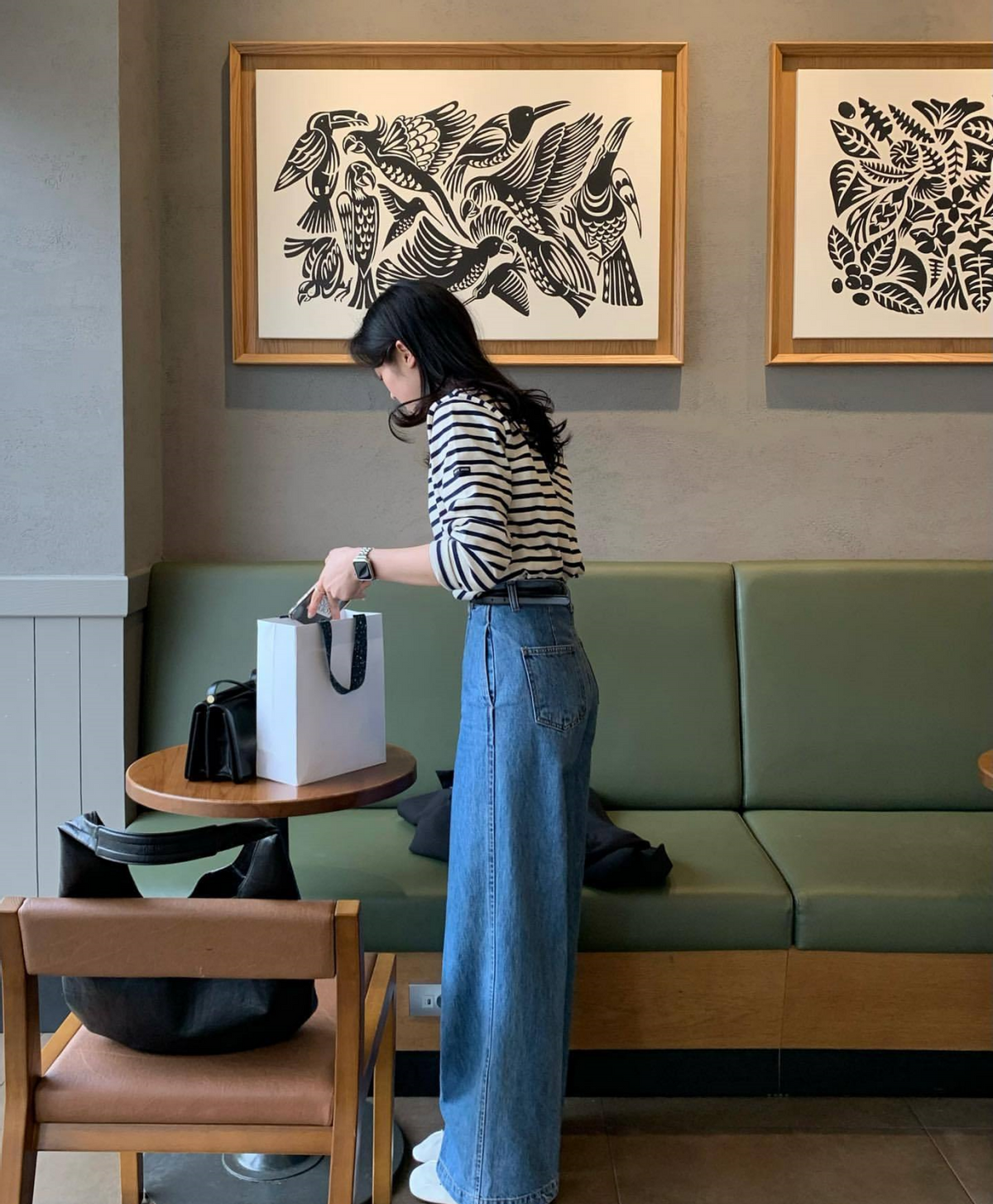T-shirts with striped elements will never go out of style no matter how you wear them. Pair them with denim wide-leg pants for a trendy yet elegant and simple look.