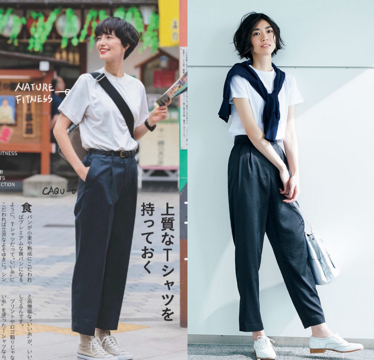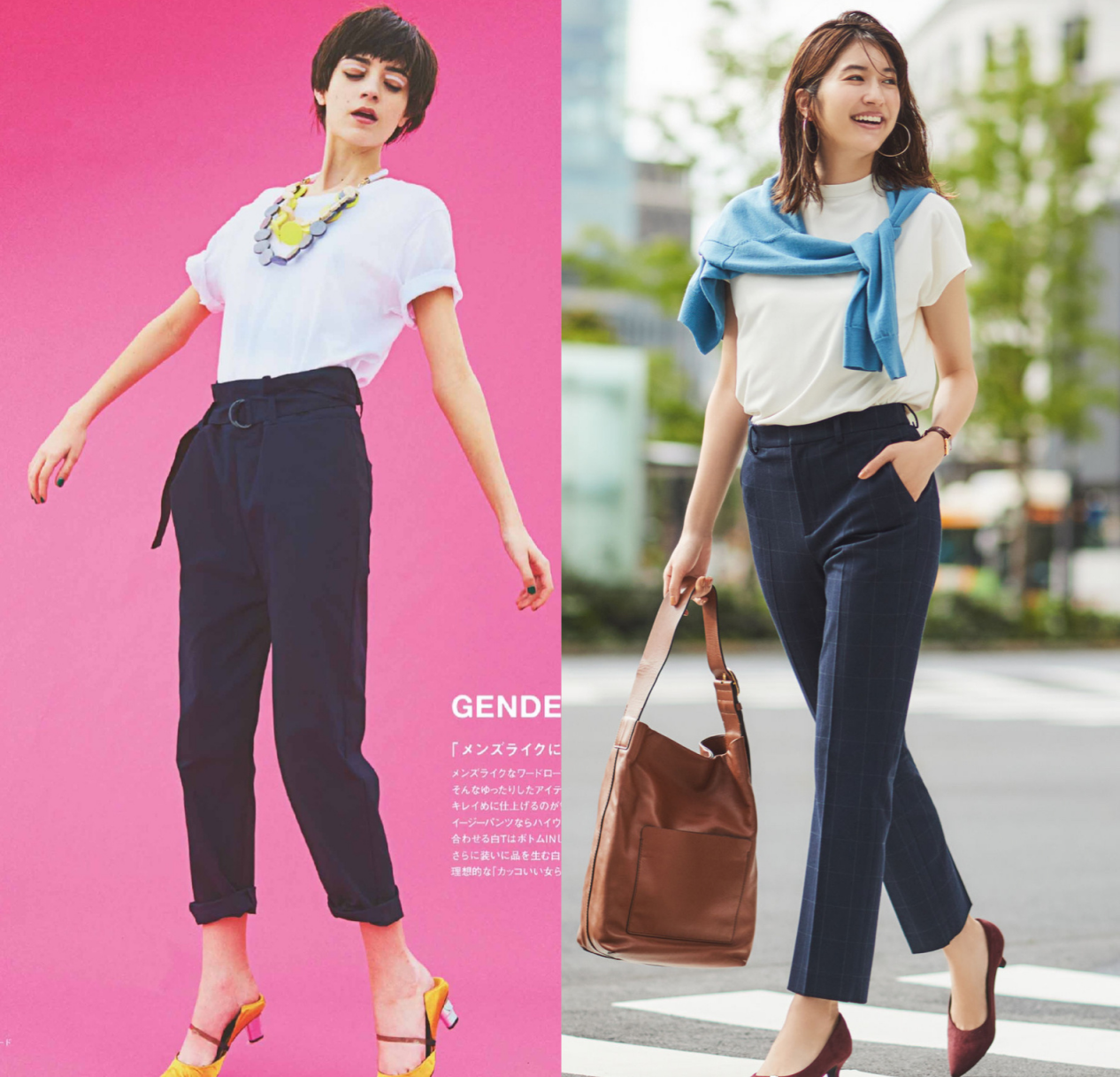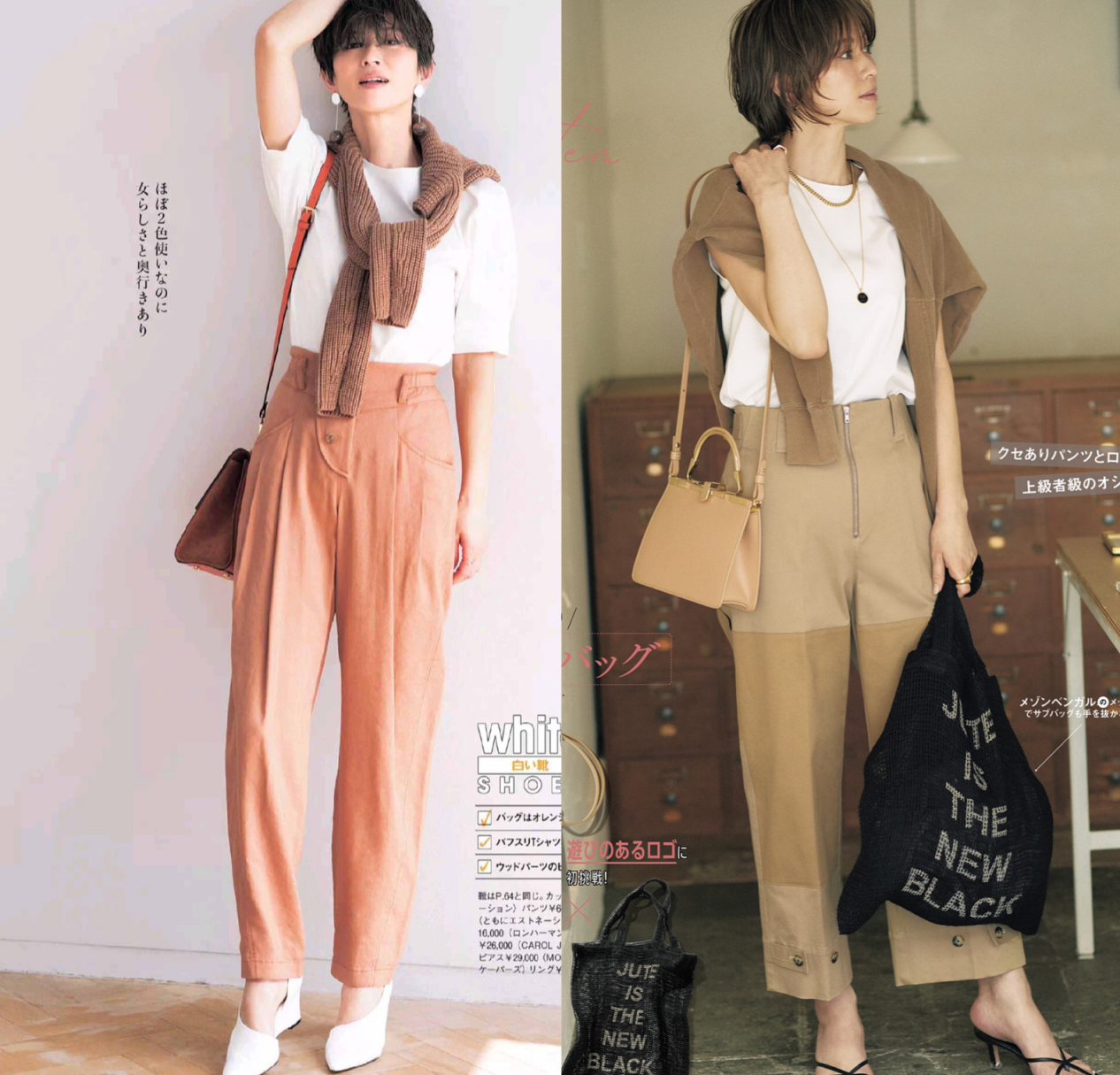 Generally It is said that the combination of solid color T-shirts and high-waisted trousers is simple and smart. At this time, adding some accessories can not only better enrich the details of the style, but also make the simple style look less ordinary and monotonous, like the following group When paired with accessories such as knitted shawls, shoulder bags, slender necklaces, etc., you can highlight your sense of sophistication and fashion.
