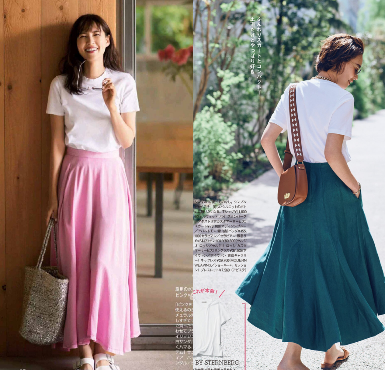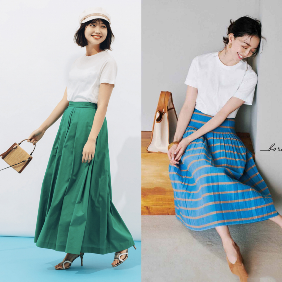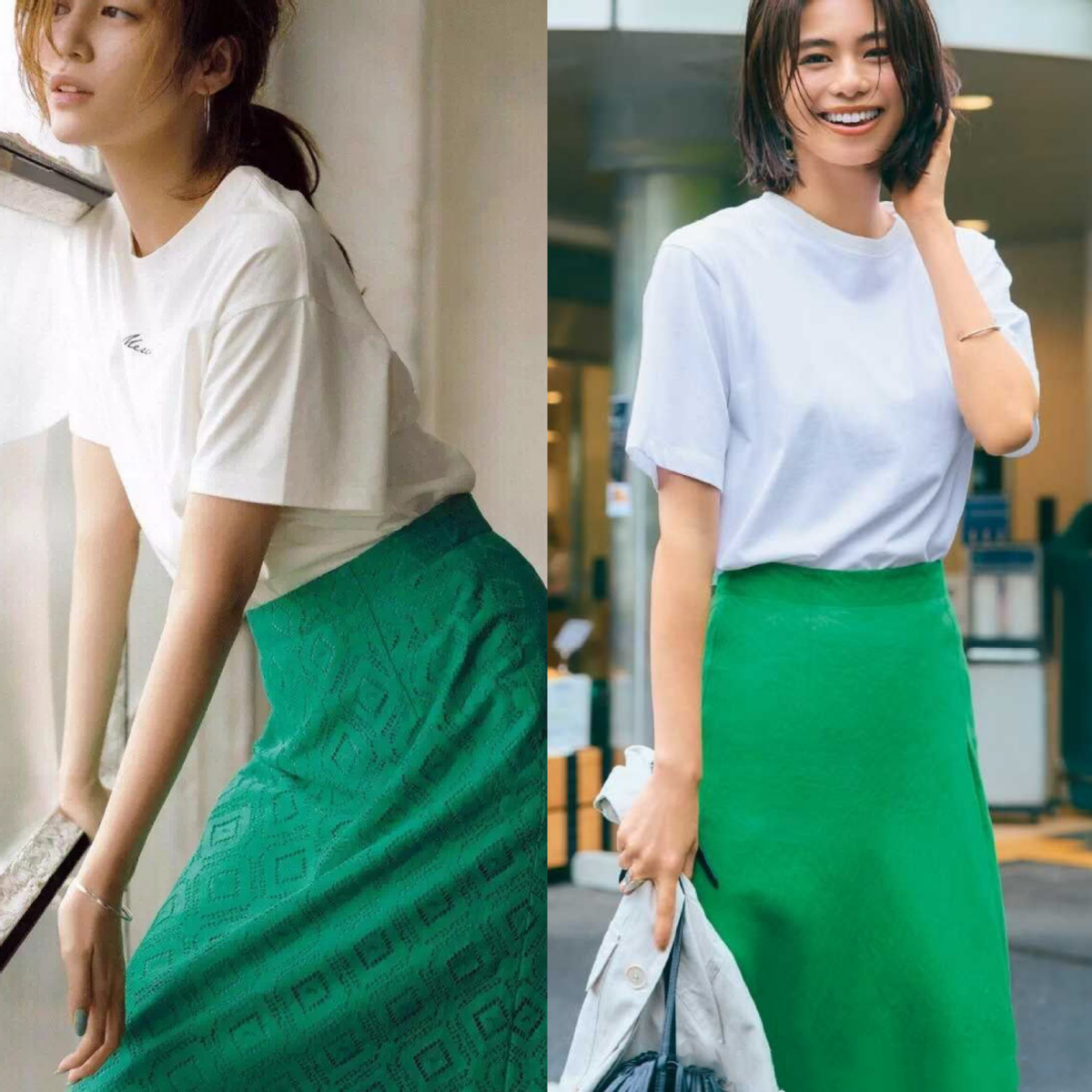 The combination of green and white can always give people an eye-catching feeling. A loose white T-shirt paired with a high-waisted skirt can not only reflect the The graceful and graceful figure also brings a sense of refreshing and elegance to summer matching. In addition to choosing this solid green skirt, this green skirt with printed design has a better retro feel. It goes well with a solid color T-shirt.