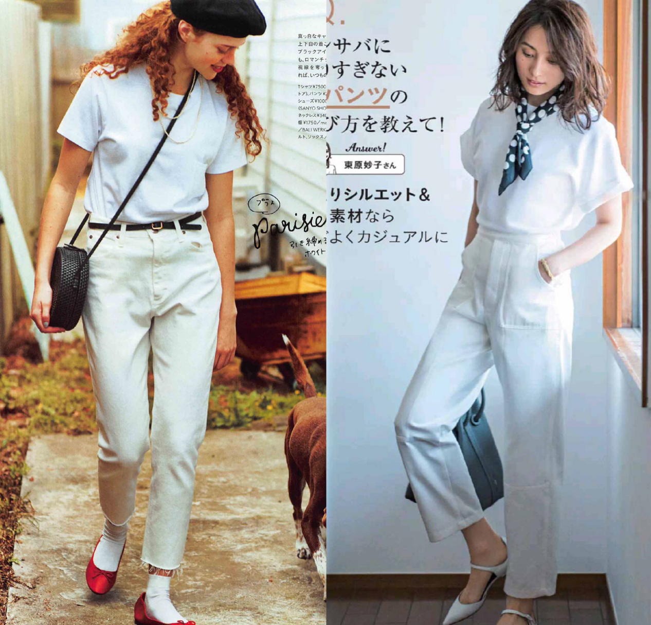 In addition to wearing a white T with jeans, high-waisted cigarette pants can also better modify the width of the hips and If you have thick legs and the neckline feels a bit empty, it is recommended to wear this colorful polka dot necklace and knitted shawl to solve this problem.