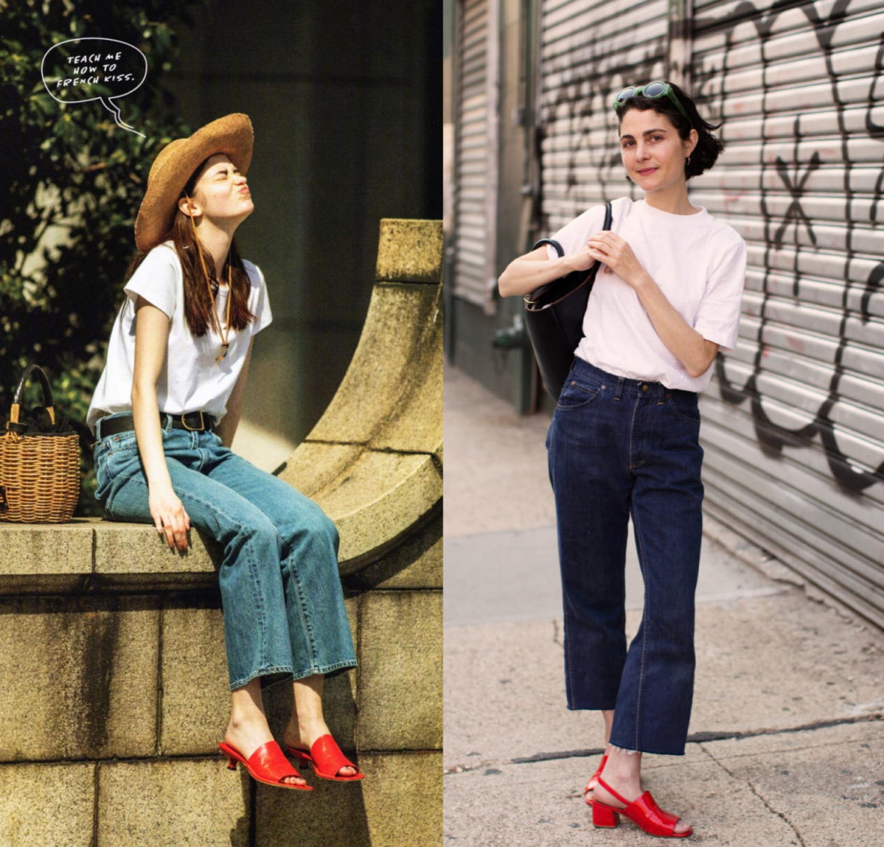 Pairing white T-shirts with jeans is a common matching idea. At this time, we can add some sunglasses or retro cowboy hats to reflect the look. It has a sense of fashion and handsomeness, like the red duckbill thick-heeled sandals worn by the young lady. It is also a representative of retro style, which perfectly weakens the boring feeling brought by the simple style.