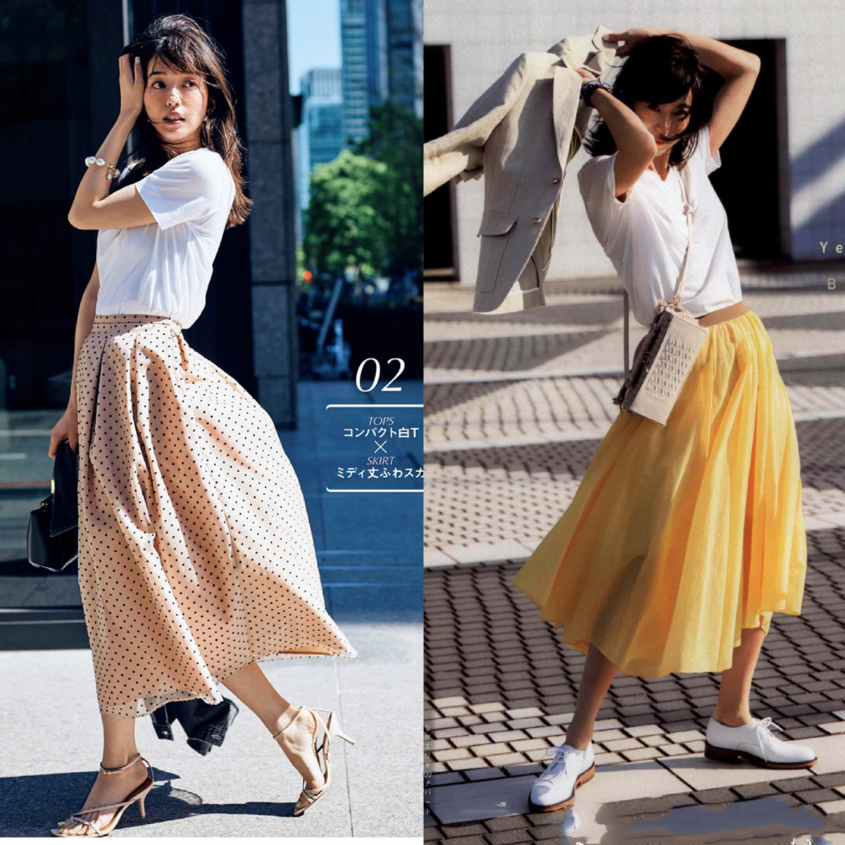 In addition to the striped skirt, this light pink skirt with polka dot elements is paired with a white T-shirt, which is sweet and age-reducing, and the feet are The stiletto pointed-toe high-heeled shoes bring elegance to the look. The combination of a white T-shirt and a yellow skirt will make you look more youthful and energetic.