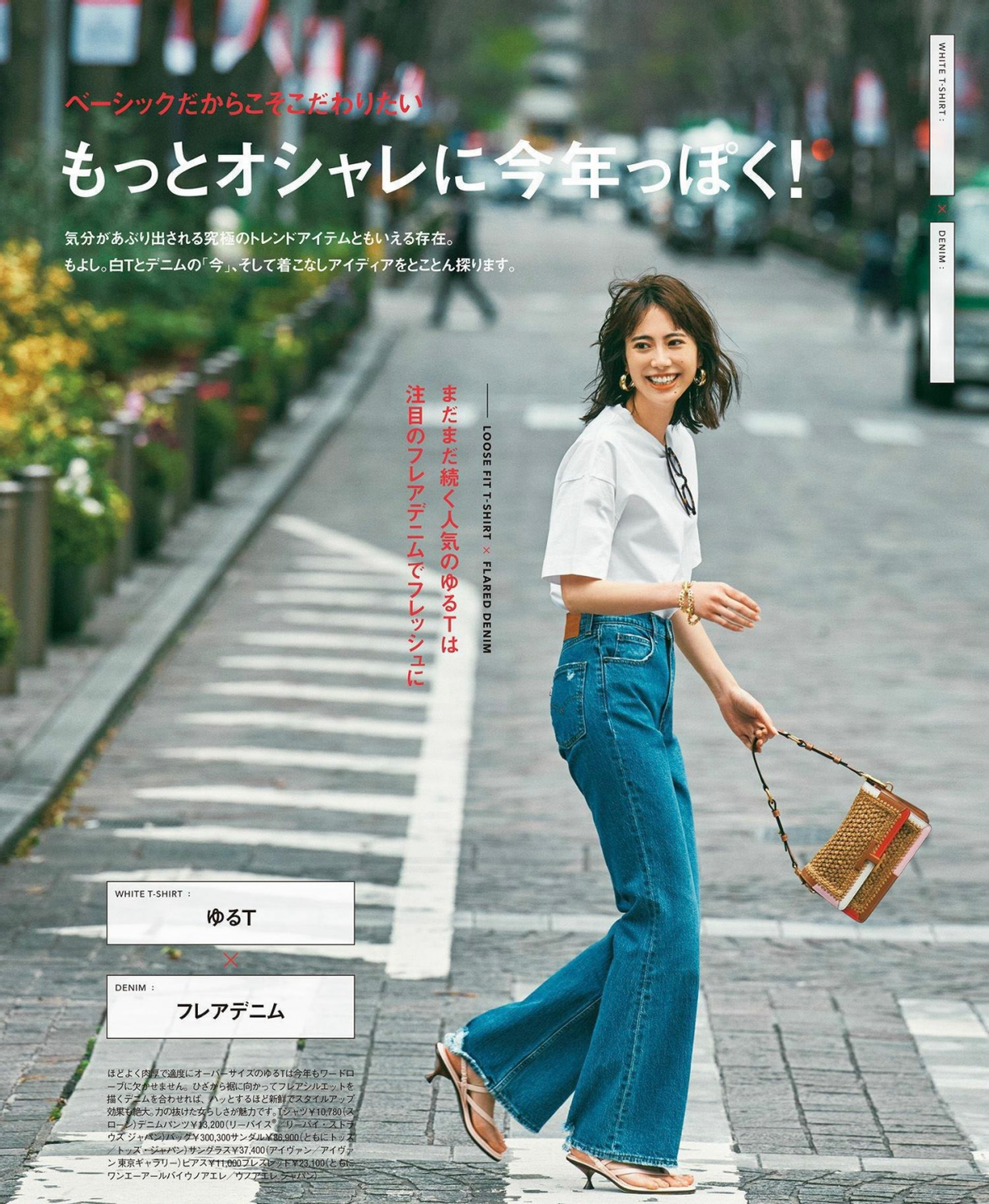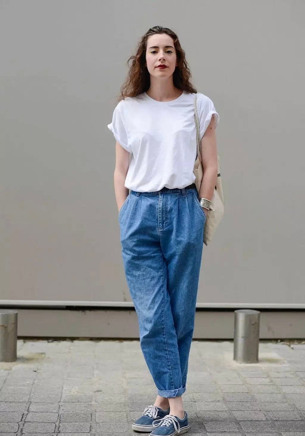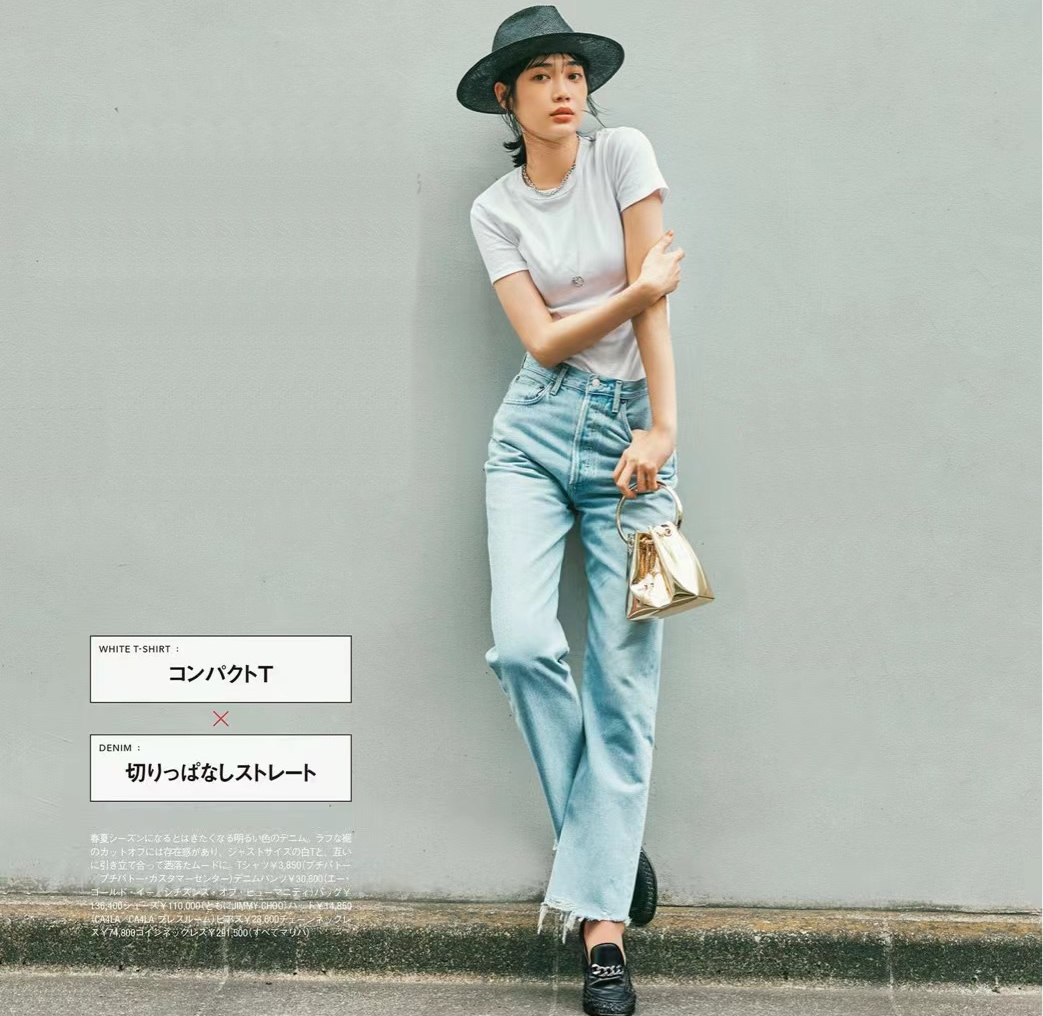 In addition to casual style, white T-shirts and jeans can also create an elegant style. It should be noted that you must choose a slightly slim white T-shirt to match with loose straight jeans.