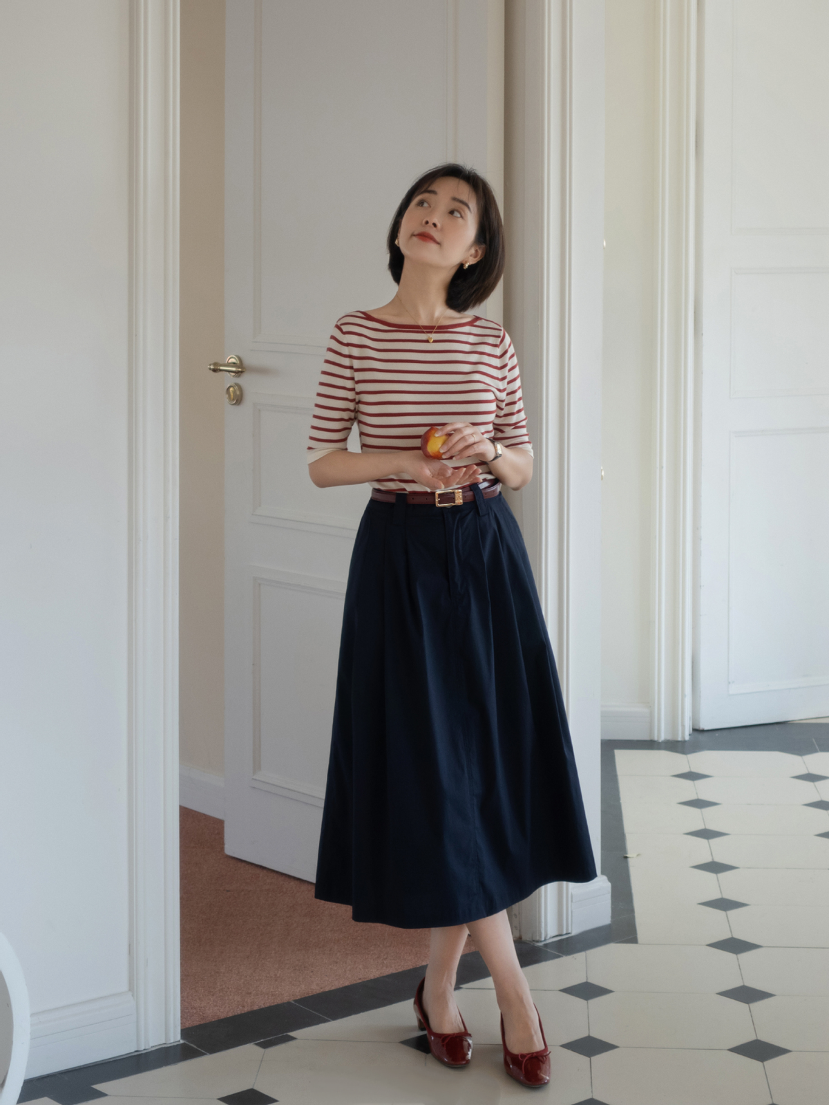 Some petite ladies can choose this kind of horizontal striped pullover T-shirt, which can visually widen the frame and make the whole person look more imposing. , the lower body can be more easily held when paired with this kind of A-line skirt.