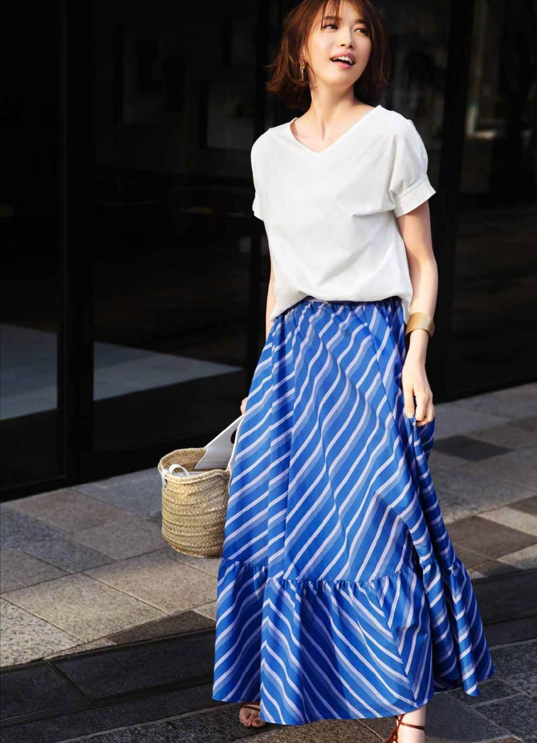 Mature women may wish to try more refreshing blue and white combinations in summer, such as this white T-shirt paired with a blue and white striped skirt, and the hem of the skirt is also added The lace-style tailoring makes it more girlish.