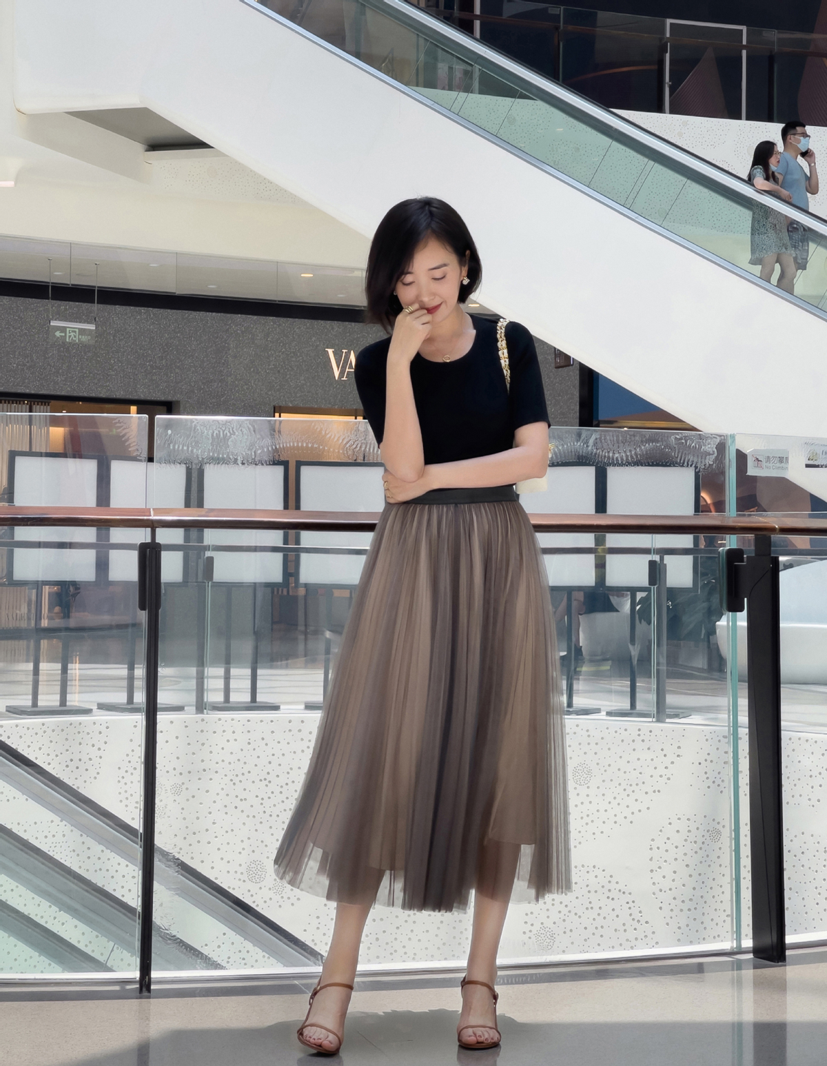 This multi-layered gauze skirt has different colors for the inner and outer skirts, which makes it look full of layers and is paired with a black knitted upper body The tight-fitting T-shirt can not only outline the graceful figure, but also look simple and elegant. Pair it with camel-colored strappy high-heeled sandals, which is refreshing and elegant.
