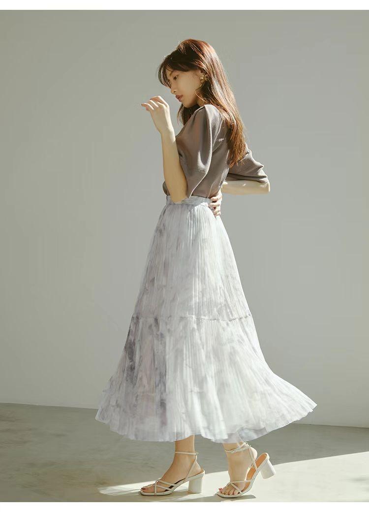 Gauze skirt is more suitable for creating a girly style. The light and elegant skirt gives people a non-flexible and breezy aesthetic. , paired with khaki knitted short sleeves and white strappy thick-heeled sandals, full of elegant and high-end femininity.