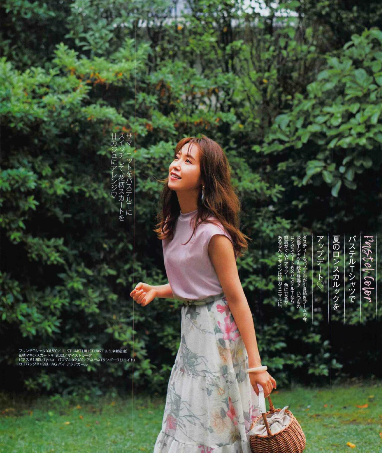 For many mature women, The first requirement is to look young when wearing an outfit. It is recommended that you choose this tender pink sleeveless T-shirt paired with a light printed skirt. This way, it looks pink and tender, quite girlish, and at the same time blends in with the surrounding people. The green background is also very matching, making the whole person very eye-catching.