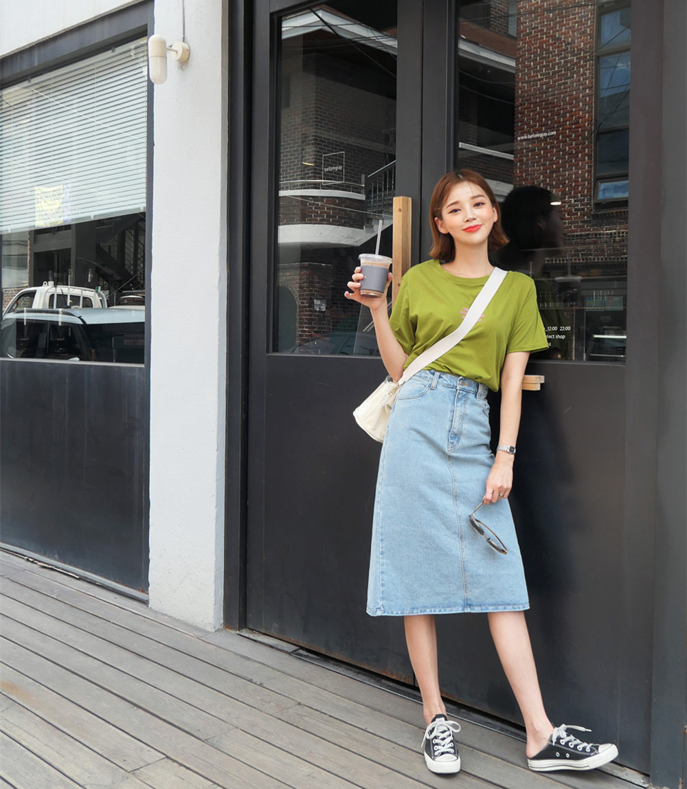 Some young and beautiful girls like to wear this kind of denim straight skirt to show off their good figure, and at the same time, they also look full of personality. The avocado green short sleeves look tender and white. The denim skirt is just above the knee, revealing the slender calf line. Paired with canvas slippers, it is casual and fashionable.